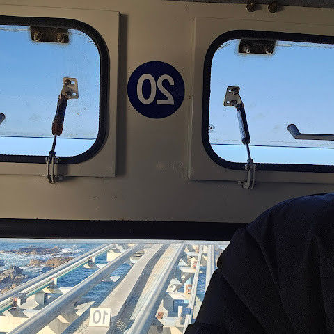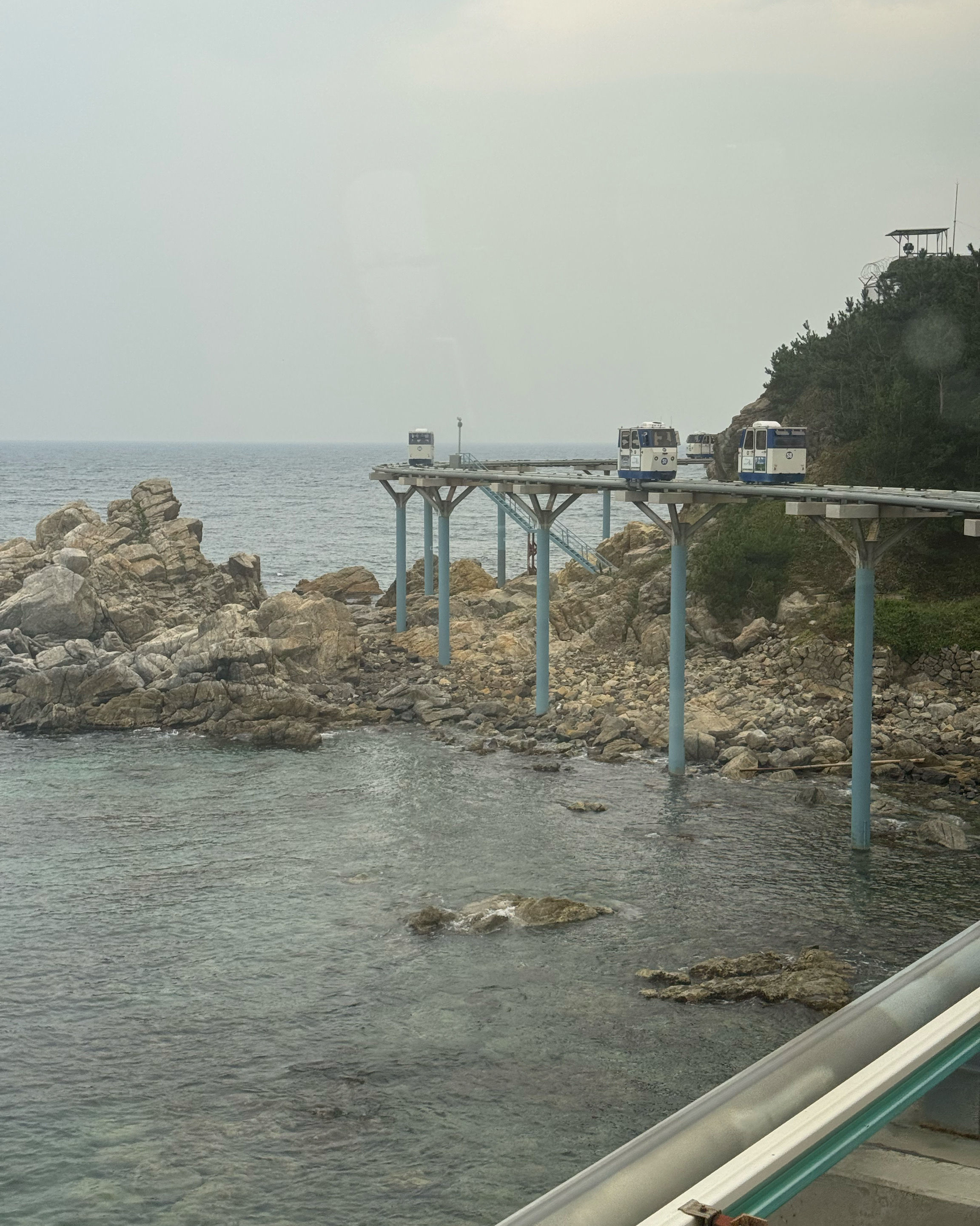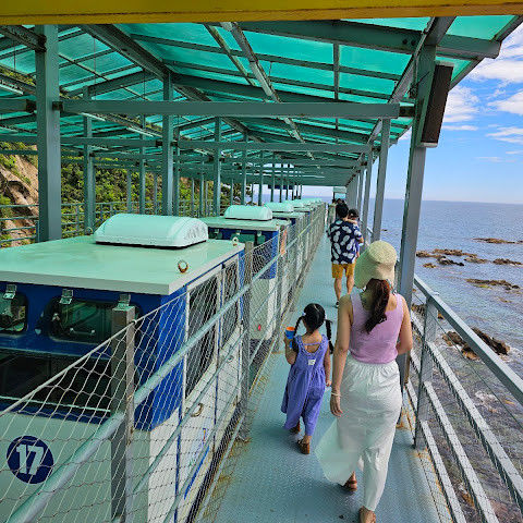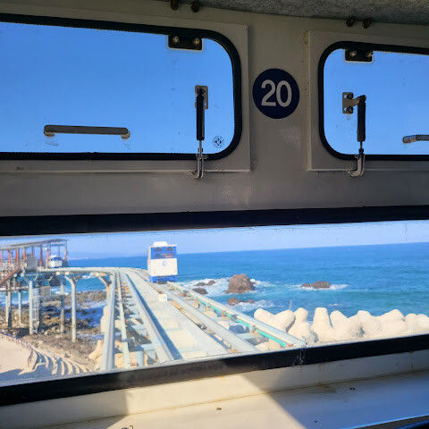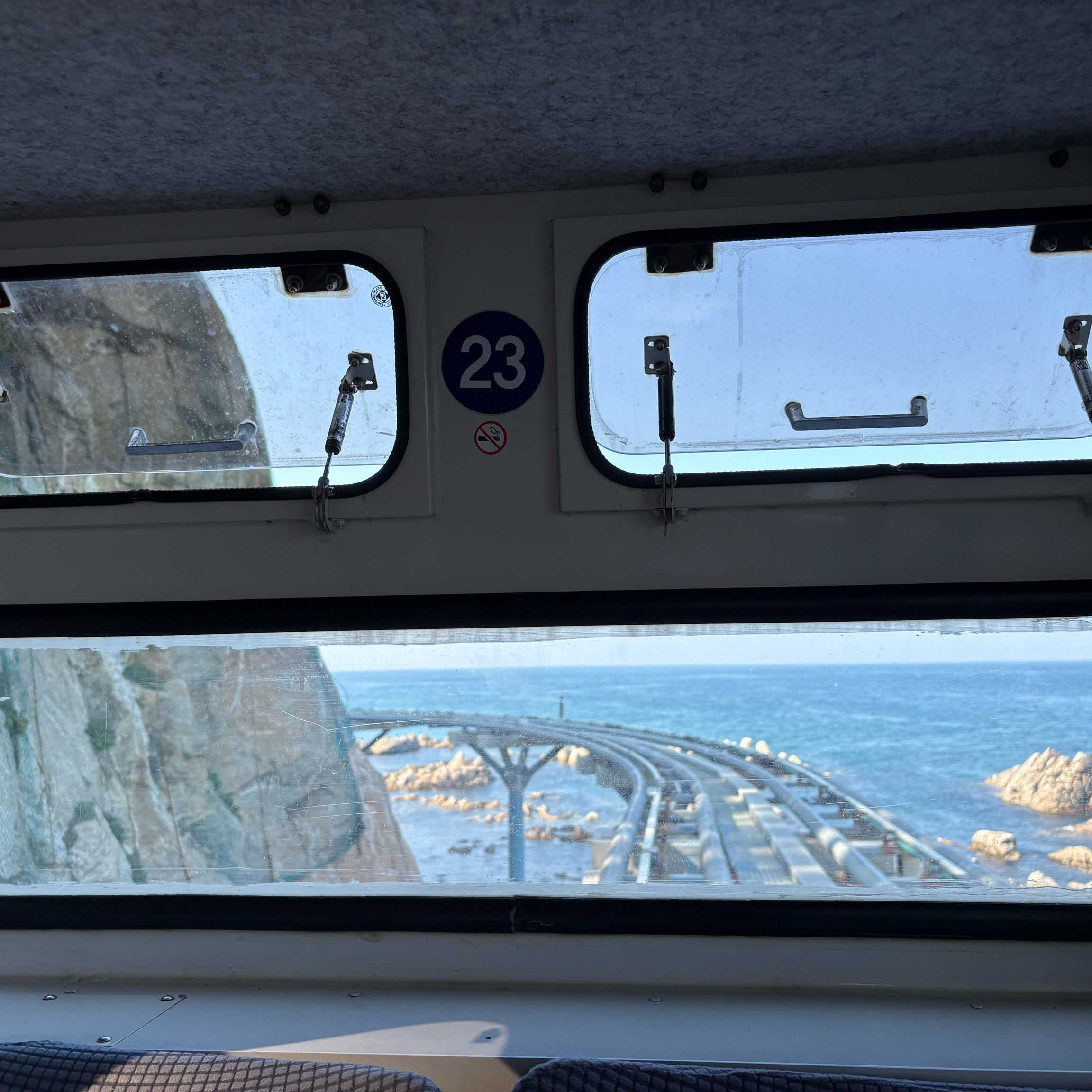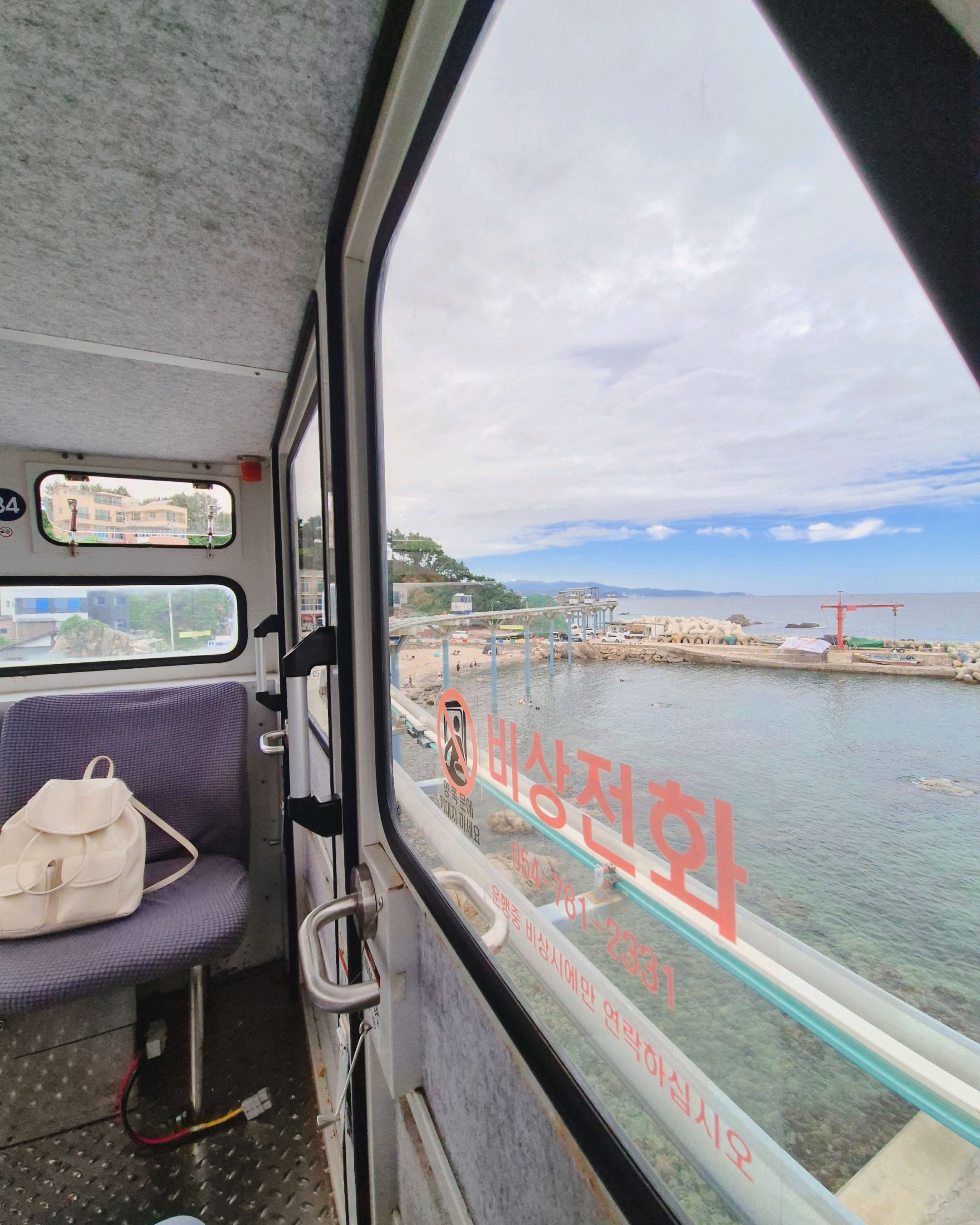 바다풍경은 너무 좋아요! 스카이레일 좌석이 차체자체에 쇼바가 없는거같은데 좀타다보면 엉덩이와 허리가 좀 아픕니다. 소음도 좀 있어서..바다낭만이 반감되요..