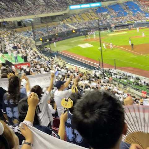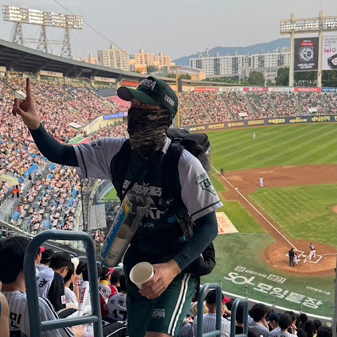 이 야구 경기장은 정말 환상적이에요. 현장감이 강렬하죠. 공격할 때는 모두가 함께 응원하고, 휴대폰을 보는 사람은 거의 없어서 다들 집중력이 최고예요!