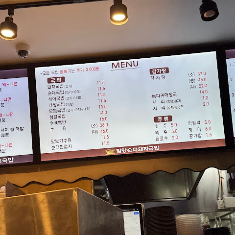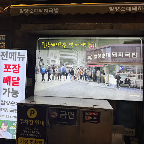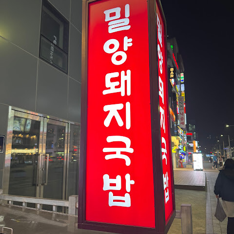 24시간 연중무휴로 운영되는 밀양순대돼지국밥은 14년여를 오로지 돼지국밥만 연구해 온 맛집이다. 순수 국내산 돼지뼈 사골을 48시간 이상 고아 낸 진하고 뽀얀 국물에 고기와 파를 넣어 뚝배기에 나오는데, 국물 맛이 깔끔하고 담백하다. 미리 나온 부추와 소면을 넣고 새우젓과 양념장을 풀어 넣어 밥과 함께 먹으면 배 속이 든든해진다. 국밥 안에 들어 있는 쫀득하게 씹히는 고기는 잡내 없이 깨끗한 맛이라 처음 돼지국밥을 접하는 사람도 거부감 없이 즐길 수 있다. 돼지국밥 외에도 순대국밥, 섞어국밥, 내장국밥, 모둠국밥 등 입맛에 따라 선택하여 주문할 수 있으며, 감자탕, 뼈해장국도 진한 맛이 일품이다.