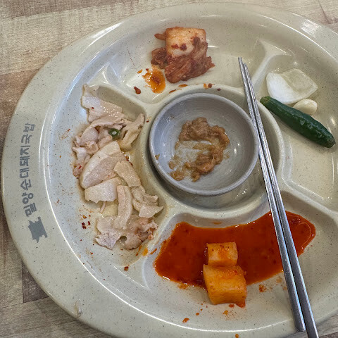 "아이들이 먹을 만큼 다대기(양념)는 넣지 말고 따로 주세요." (아이들 음식에는 고추장을 넣지 말고 따로 주세요.) 아이들은 너무 배가 고팠는지 밥 한 그릇과 수육반을 반 접시씩 먹고 국물까지 싹 비웠습니다.