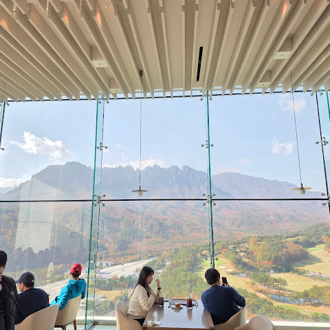 설악산 울산바위 전경을 통창을 통해 볼 수 있는 카페, 계절에 따라 대하는 전망이 색달라 특성이 있을 듯하고, 주변 전망 또한 아름다워 추천~