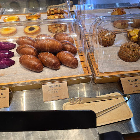 지민 관련 상품은 다 있어요! 분위기도 좋고, 빵 종류도 다양해요.