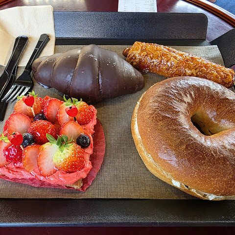 평일 아침 일찍이라 줄도 없고 자리도 넉넉했습니다. 커피는 은은한 캐러멜 향이 나면서도 진해서 좋았습니다. 아침 식사 중 가장 만족스러웠습니다. 메뉴는 대부분 단 음식이었고, 짭짤한 음식은 거의 없었습니다. 그나마 있던 올리브 피자 브레드는 기름기가 너무 많아 다 먹지 못했습니다. 단 음식을 좋아한다면 선택의 폭이 넓겠지만, 저로서는 다시 방문하고 싶을 만큼 짭짤한 메뉴가 부족했습니다.