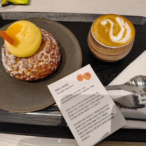오렌지 캔디를 곁들인 에스프레소 시그니처 음료를 추천합니다. 달콤하지만 과하지 않고, 오렌지 향이 은은하게 풍겨요. 분위기는 괜찮고, 작은 기념품 가게와 로스팅 과정을 볼 수 있는 유리잔도 있지만, 특히 더운 여름날에는 실내가 좀 덥습니다.