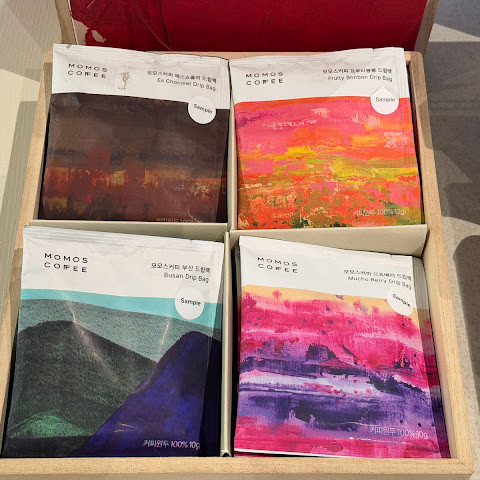 매장 안에는 커피 제품을 판매하는 코너가 있는데, 종류도 다양했습니다. 동료와 친구들에게 줄 기념품으로 드립 커피와 원두도 샀습니다.