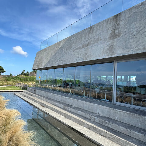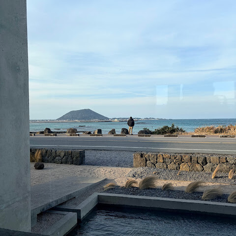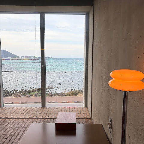 커다란 유리창은 마치 조용한 액자처럼 동해와 바다 건너 우도를 은은하게 담아내고, 건물 반대편에는 제주 특유의 화산암으로 둘러싸인 정원이 펼쳐져 있다.