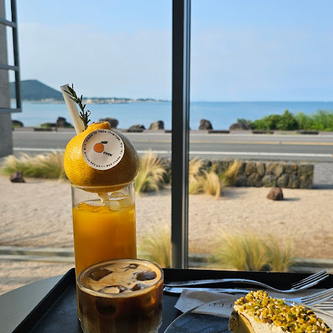 넓고 무료 주차 공간이 있는 아름답고 현대적인 카페입니다. 정말 맛있는 한라봉 오렌지와 함께 나오는 한라봉 오렌지 주스를 즐겼습니다. 커피는 잘 만들어졌고 진했습니다. 페이스트리는 맛보다 보기에 더 맛있어 보였고, 특히 디자인과 음료 때문에 이곳을 추천합니다. 국내외 관광객이 많지만, 항상 앉을 자리가 있습니다 (두 번이나 갔어요!) :)