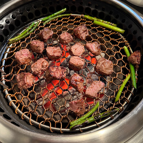 모든 것이 훌륭했지만, 그들의 특산품이기 때문에 기대하고 있던 안심에 실망했습니다. 생고기를 자르면 먹음직스러워 보이기보다는 좀 더 힘차게 보였고, 한쪽 면이 빨리 익어 숯불이 너무 뜨거웠던 것 같습니다. 전체적으로 좀 뻣뻣하고 건조해졌습니다. 나는 방문하는 친구에게 한국 한우를 강조하고 싶었지만 더 많은 바베큐 쇠고기를 주문할 자신이 없었습니다.