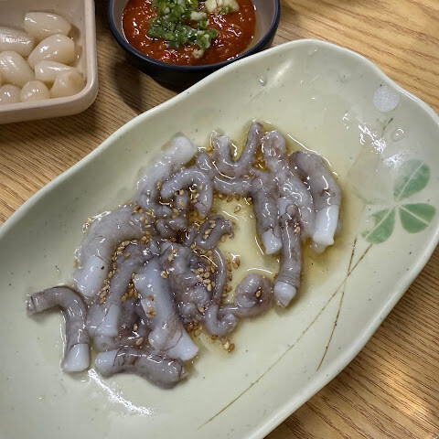 구글 지도에서 찾은 사시미 가게는 평점이 아주 높았습니다. 같은 지역에 가게가 두 곳 있었는데, 오후 5시 20분에 일찍 도착해서 좀 더 작고 오래된 가게를 선택했습니다. 그런데 벌써 줄이 길게 늘어서 있었어요! 다행히 저희는 두 명뿐이라 10분 정도만 기다리면 자리가 나왔습니다. 가게 안에 계신 아주머니께서 중국어를 유창하게 하셔서 저희를 소개해 주시고는 서비스로 문어 사시미 한 접시를 주셨어요! 더 이상 주문할 필요 없다고 하시더군요.