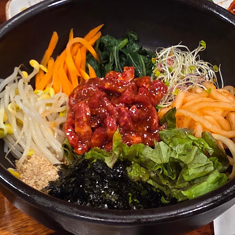 한우 소고기는 정말 맛있었어요. 적어도 대부분은 맛있었지만, 그 사이에 촉수도 좀 있었어요. 육회 비빔밥도 꽤 맛있었어요. 다만 김치냉장고 대신 따뜻한 국물이 있으면 좋겠어요.