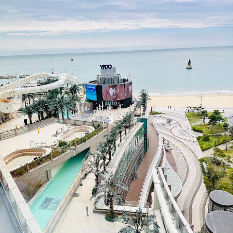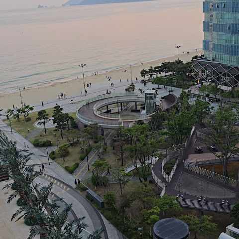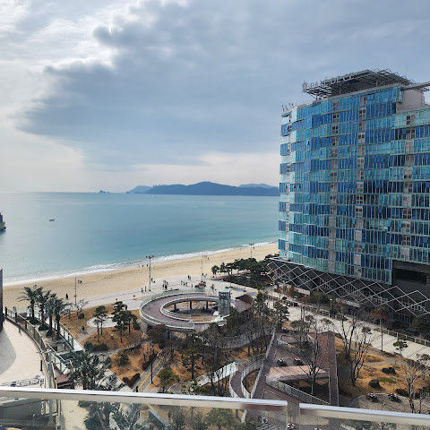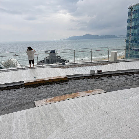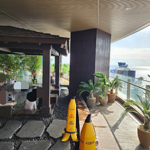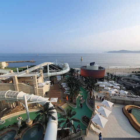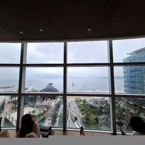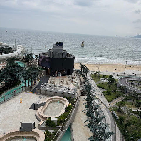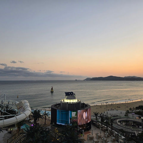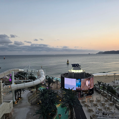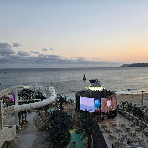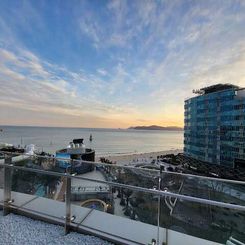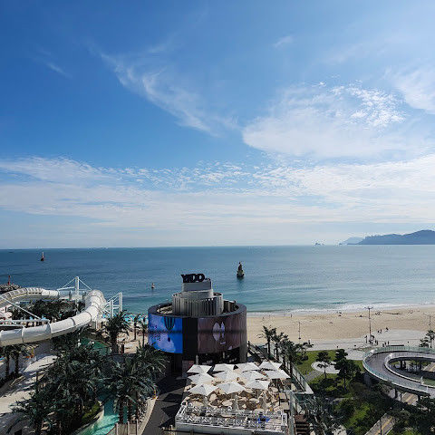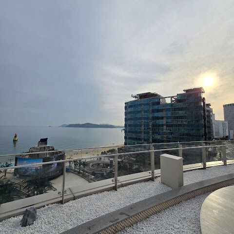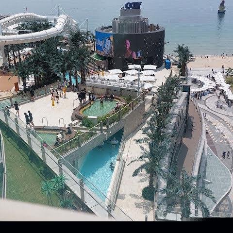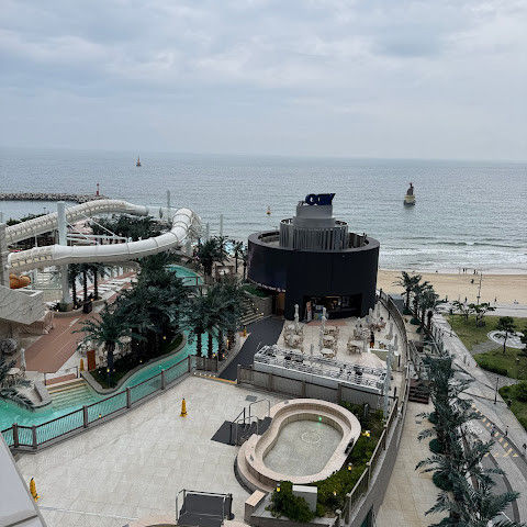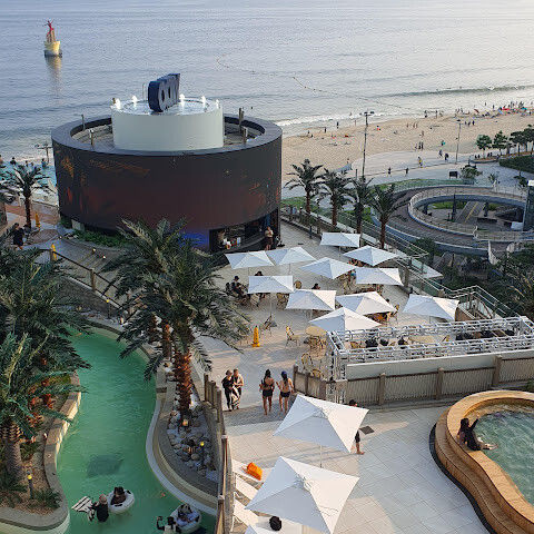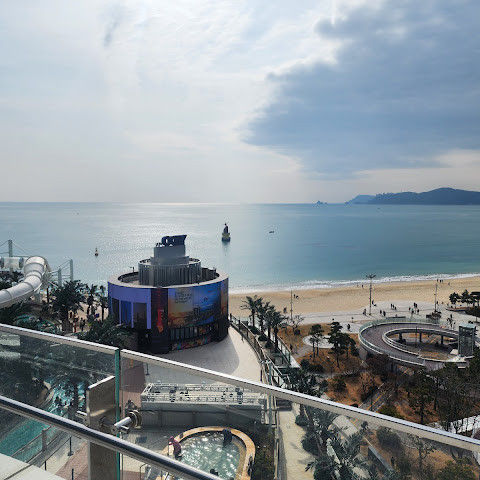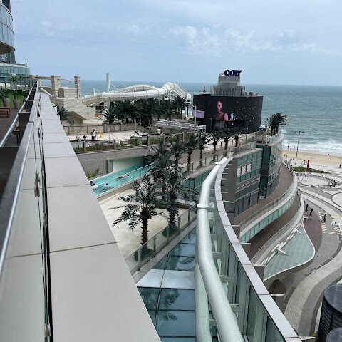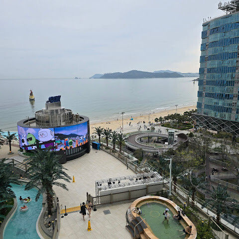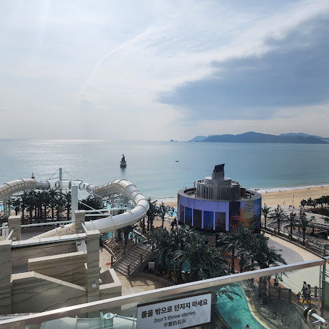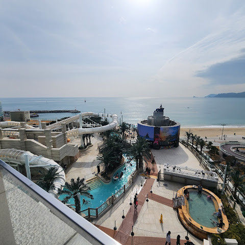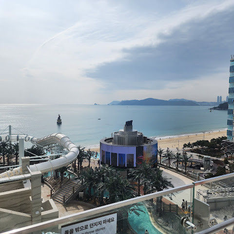 여기의 가장 큰 장점은 해운대 해변을 바라볼 수 있다는 것입니다. 아래층에는 예전에 워터파크였던 곳이지만 지금은 문을 닫은 것 같습니다. 야외 조경 공간도 있습니다. 이곳 해변의 아름다움을 느끼실 수 있을 겁니다. 식사를 할 수 있는 레스토랑도 있습니다. 많은 사람들이 족욕장을 이용합니다.