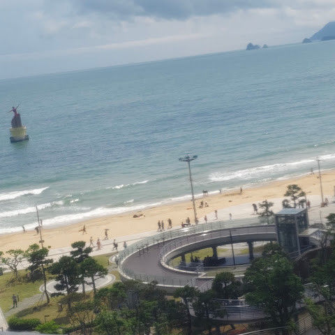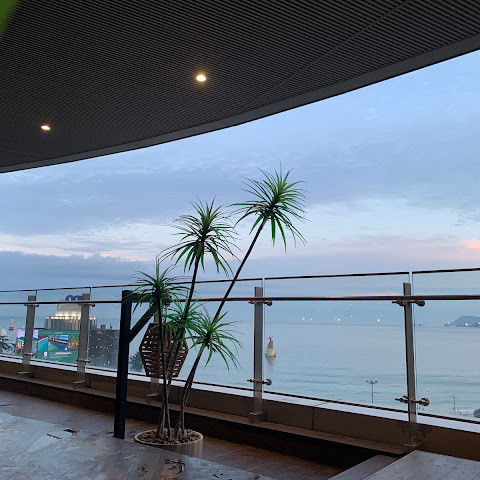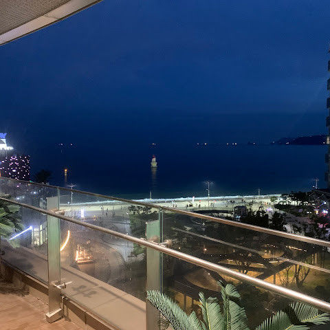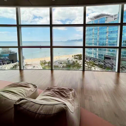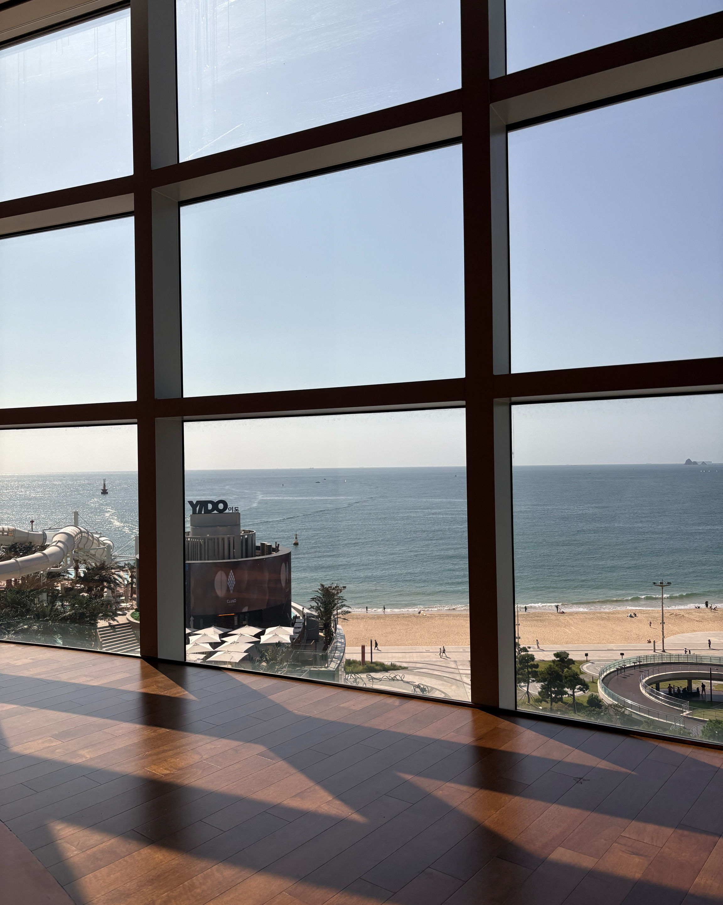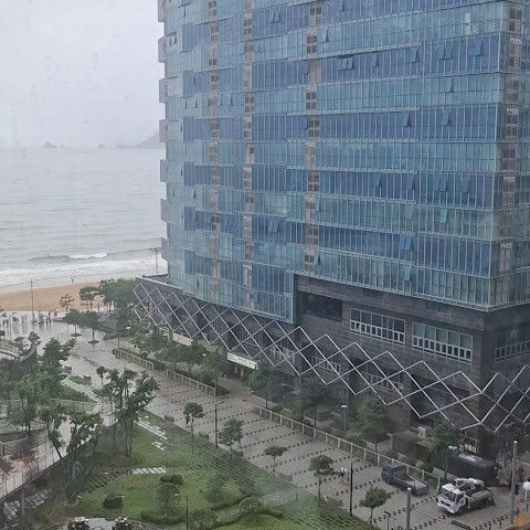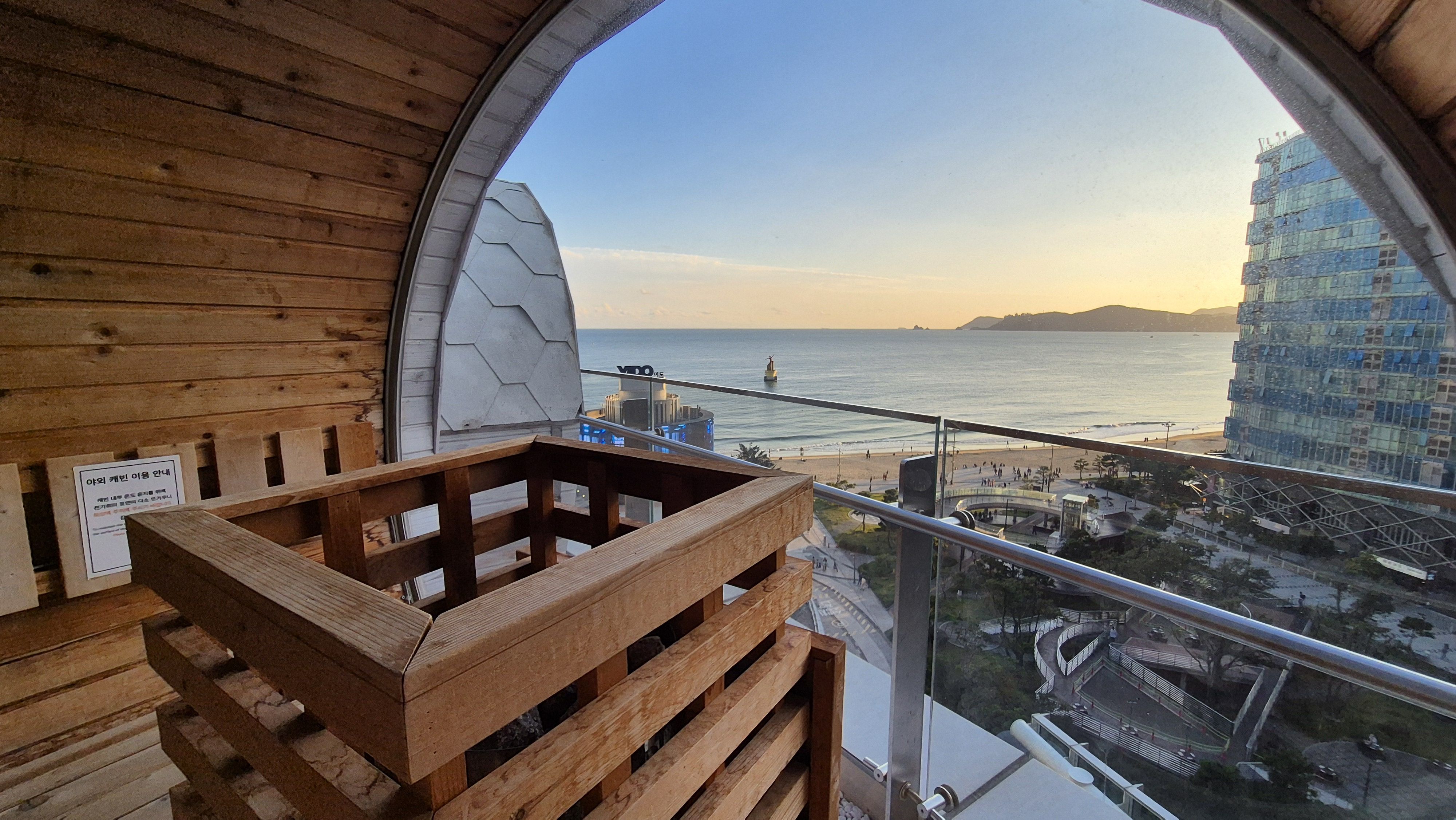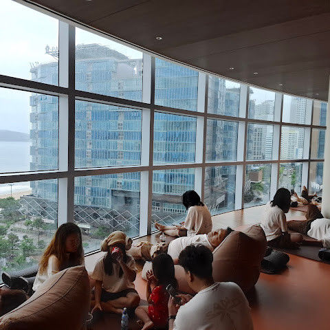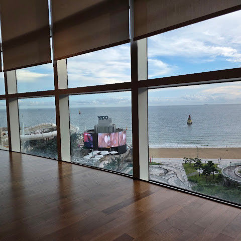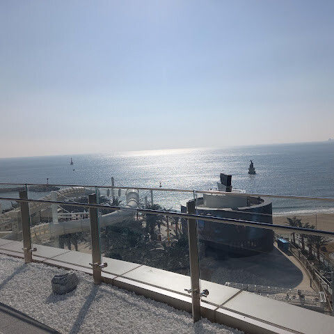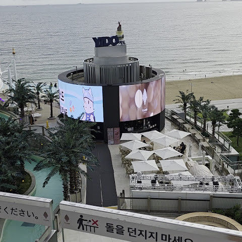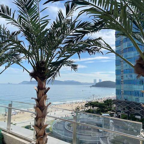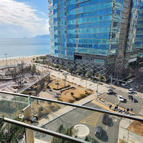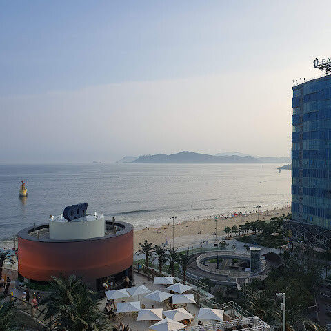 여기의 가장 큰 장점은 해운대 해변을 바라볼 수 있다는 것입니다. 아래층에는 예전에 워터파크였던 곳이지만 지금은 문을 닫은 것 같습니다. 야외 조경 공간도 있습니다. 이곳 해변의 아름다움을 느끼실 수 있을 겁니다. 식사를 할 수 있는 레스토랑도 있습니다. 많은 사람들이 족욕장을 이용합니다.
