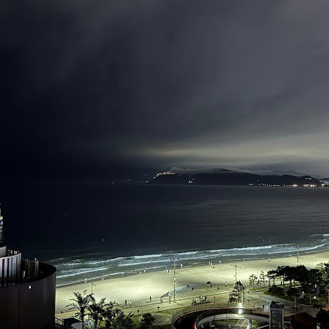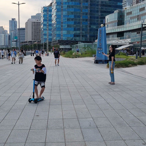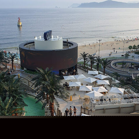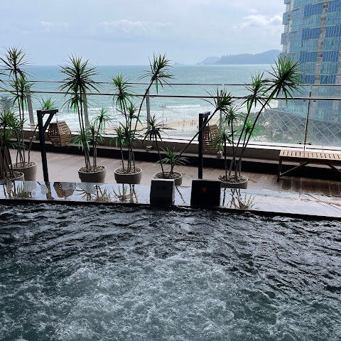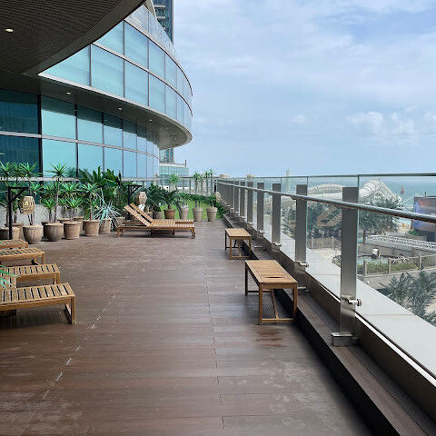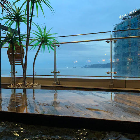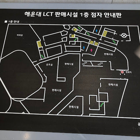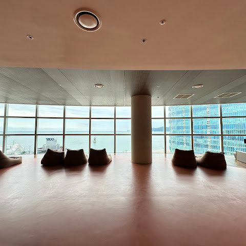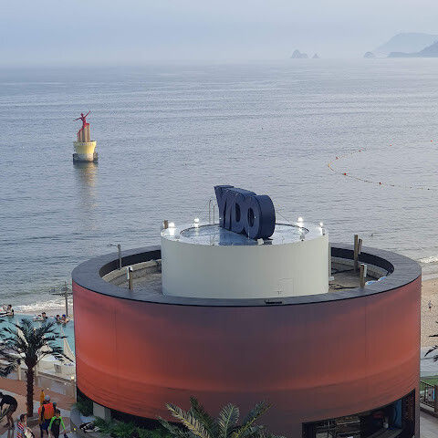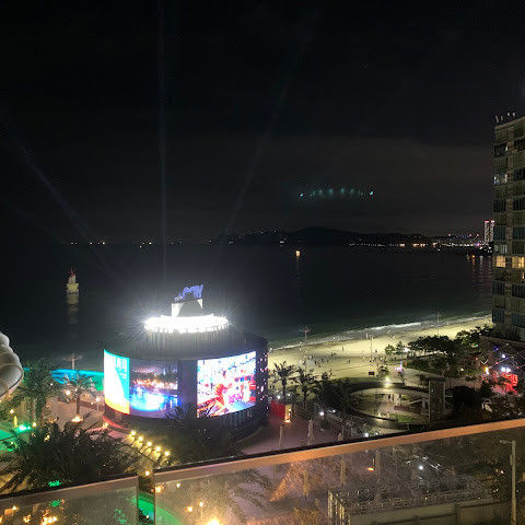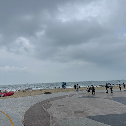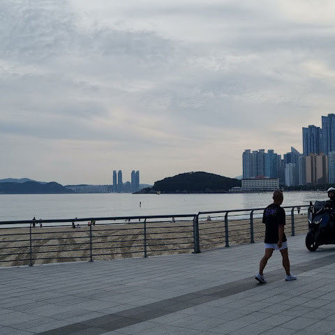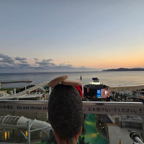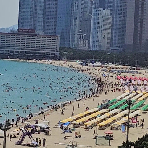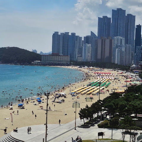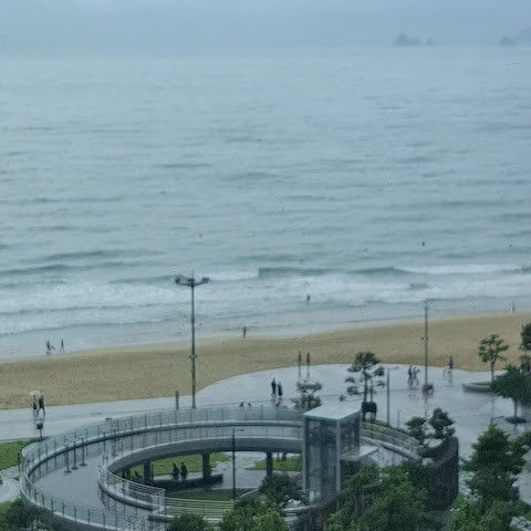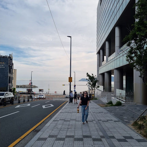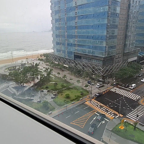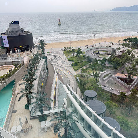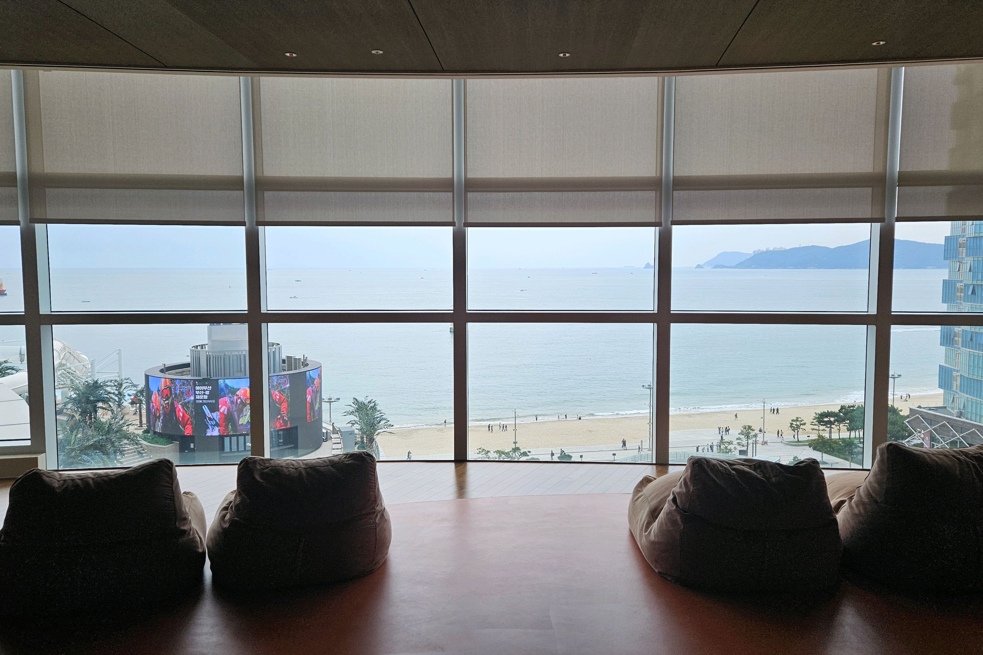 여기의 가장 큰 장점은 해운대 해변을 바라볼 수 있다는 것입니다. 아래층에는 예전에 워터파크였던 곳이지만 지금은 문을 닫은 것 같습니다. 야외 조경 공간도 있습니다. 이곳 해변의 아름다움을 느끼실 수 있을 겁니다. 식사를 할 수 있는 레스토랑도 있습니다. 많은 사람들이 족욕장을 이용합니다.
