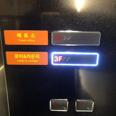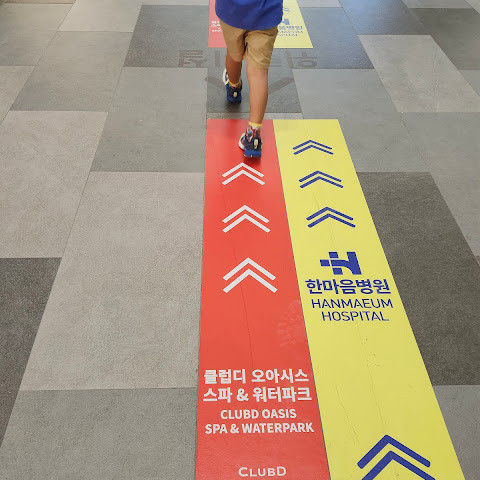 부산 24시간 패스 일정 중 하나입니다. 건물에 들어가면 바닥에 안내판이 있습니다. 안내판 색깔을 따라가면 엘리베이터로 안내해 줍니다.
