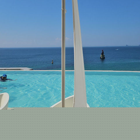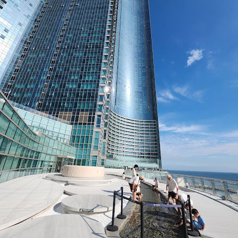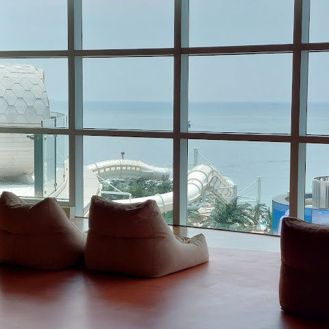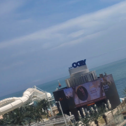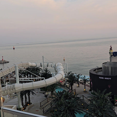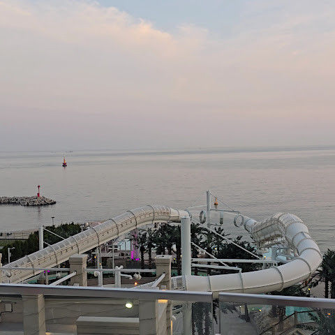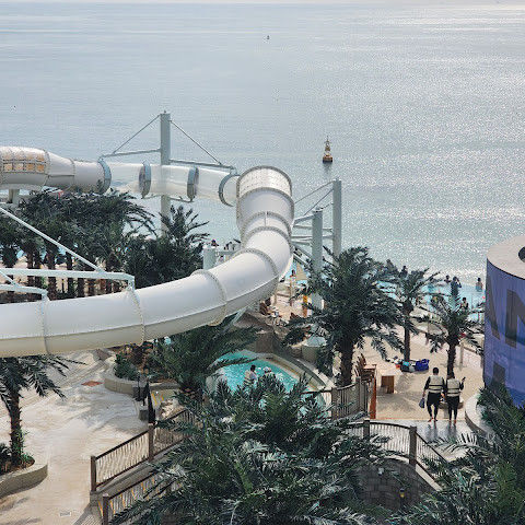 아름다운 인피니티 풀과 멋진 해변 전망을 자랑하는 작은 워터파크입니다. 워터슬라이드는 재밌지만 줄이 꽤 길어요. 시설은 괜찮고, 위층 사우나도 아주 좋아요.