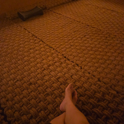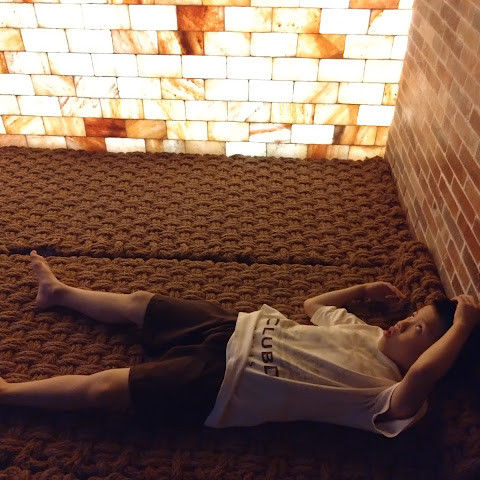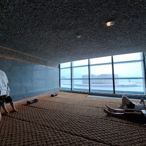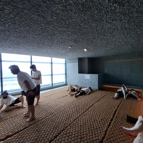 한 시간 넘게 몸을 담근 후 옷을 갈아입고 찜질방으로 향했어요. 쉼터, 요가 매트, 매점, 식당이 많이 있었어요.