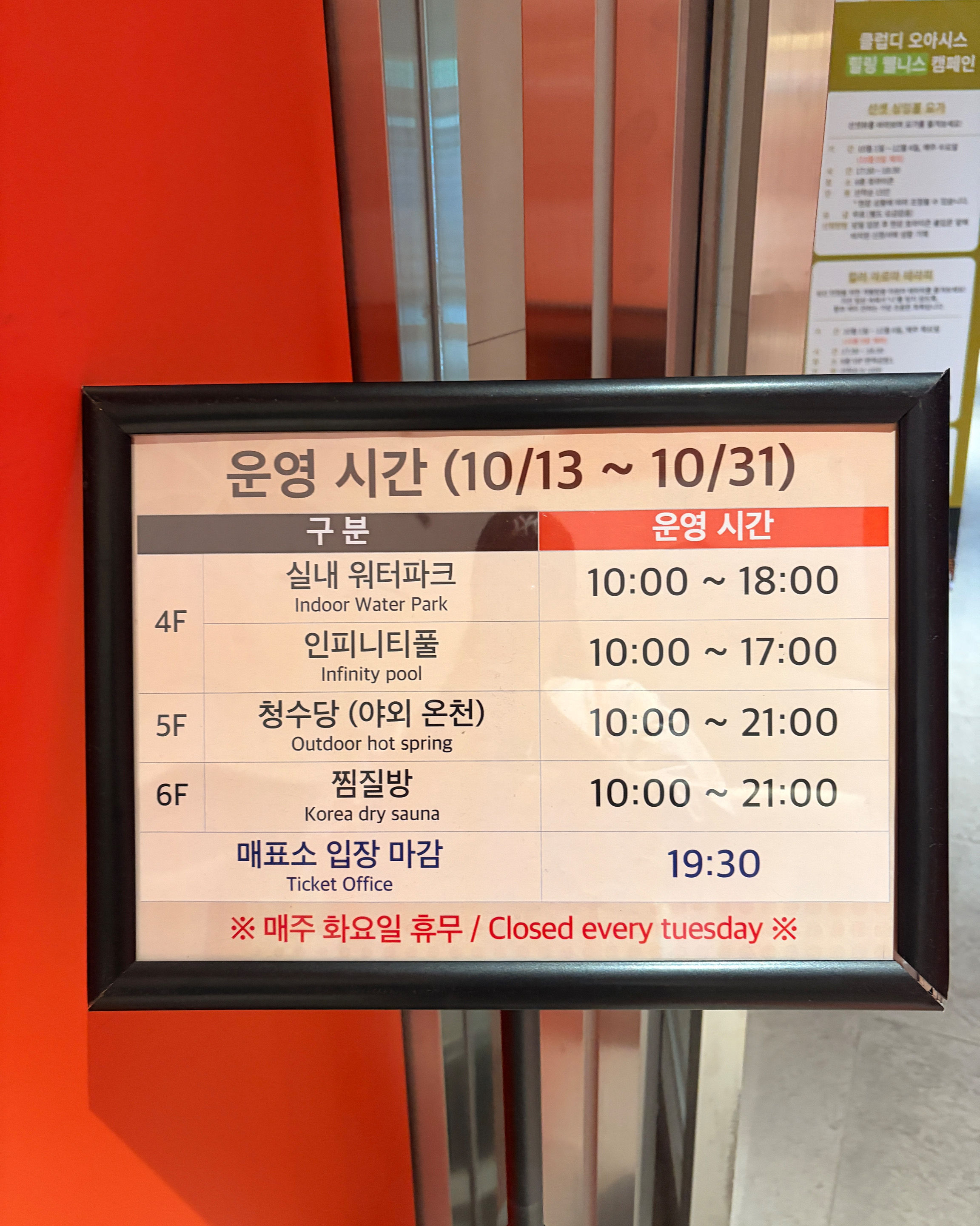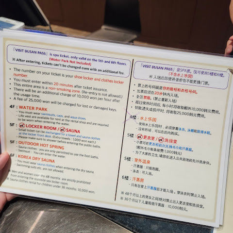 찜질방은 처음인데 정말 특별해요!! 늦어도 오후 8시 전에 입장해야 하고, 오후 9시까지 머무를 수 있어요. 부산 방문 패스를 이용하면 정말 좋아요✌🏻