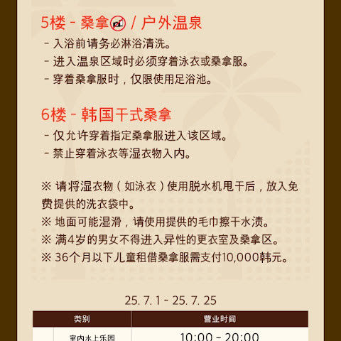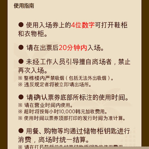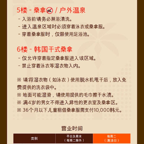 해운대에 있는 대형 사우나로, 시내 백화점 근처 사우나보다 훨씬 큽니다. 5층과 6층은 24시간 또는 48시간 이용권으로 이용 가능하며, 3시 또는 5시 방향의 보라색 이용권을 선택할 수 있습니다. 단, 4층 워터파크는 이용하실 수 없습니다.