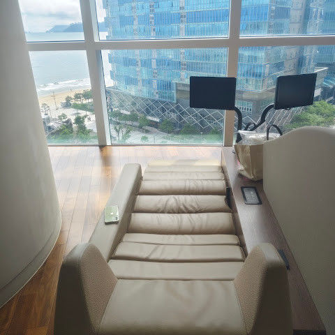 찜질방 시원스레 탁트인 통유리 바다 전망에 1인 쇼파들