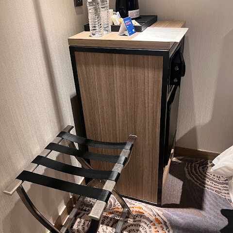 객실의 작은 테이블 위에는 스탠드 조명과 화장대 거울, 그리고 옷걸이가 넉넉하게 마련되어 있었습니다. 이런 세심한 배려가 마음에 들었습니다. TV는 크지는 않았지만 클래식 음악을 포함해 50개가 넘는 채널이 나왔습니다. 방은 작았지만 짐 몇 개는 충분히 놓을 수 있었습니다. 저희는 싱글 침대 세 개가 있는 트리플룸에 묵었습니다. 투숙객도 많았고 주변도 활기찼으며 쇼핑과 식당가도 매우 편리했습니다. 공항에서 도착하든 서울 시내로 향하든, 저는 항상 홍대 쇼핑 지구에 숙소를 잡는 것을 선호합니다.