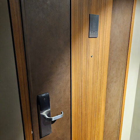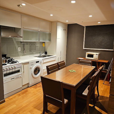 장점: 거실, 다이닝룸, 침실 2개, 욕실 모두 넓어서 4인 가족이 지내기에 편안했습니다. 식기류, 냉장고, 세탁기, 빨래 건조대, 다리미, 가스레인지, 오븐, 넷플릭스가 설치된 TV가 구비되어 있었습니다. 명동에서 조금 떨어져 있지만 비교적 조용하고 이동하기 편리했습니다. 입구 골목에 경찰서가 있고, 호텔 창문에서 남산타워가 보입니다.
