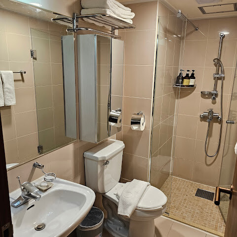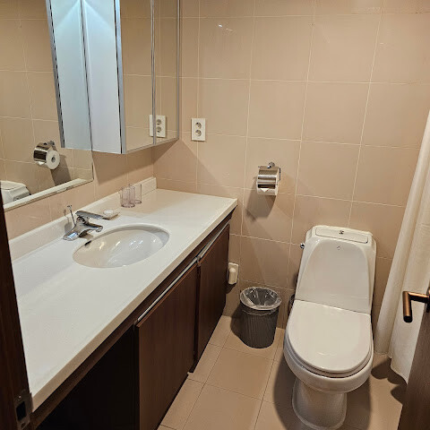 단점: 명동에서 걸어서 10분 정도 걸리지만, 충무로역에서는 훨씬 가깝습니다. 정문이 꽤 멀고 오르막과 내리막이 있어서 뒷문으로 들어가는 것이 더 편리합니다. 충무로역 4번 출구(짐이 있으면 6번 출구)로 나와 경찰서 옆 골목을 지나 엘리베이터를 타고 로비로 가세요. 엘리베이터가 가장 빠릅니다. 욕실 수압이 약하고 수온 조절이 어려워 샤워 끝 무렵에는 물이 자주 식었습니다. 비데도 없었습니다. 저희는 6박을 묵었습니다. 셋째 날, 이모가 청소를 마치고 바닥 난방을 껐는지, 밤에 방에 돌아왔더니 지네처럼 생긴 애벌레가 바닥에서 기어 나왔습니다. 움직임이 엄청 빨랐지만 다행히 바로 죽였습니다. 😆