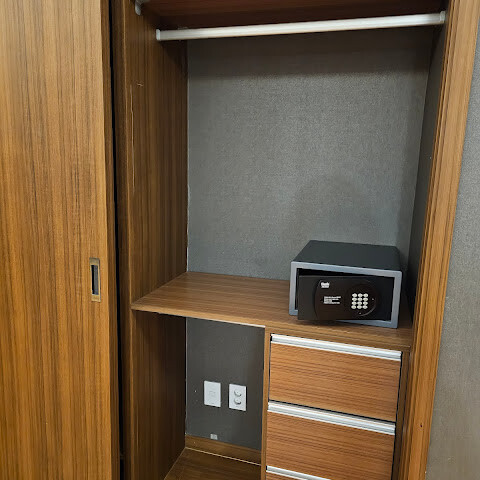 여행 가방 다섯 개를 모두 펼쳤는데도 방 안에서 편하게 움직일 공간이 충분했어요. 방에는 빨래 건조대와 삼성 세탁기(건조기 없음)가 있었어요. 엘리베이터 층 안내판에는 공용 공간에도 세탁기와 건조기가 있다고 나와 있었지만(유료인 것 같았어요), 저는 이용하지 않았어요. 빨래볼을 가져와서 매일 빨래하고 빨래 건조대에 널었더니 다음 날 다 말라 있었어요. (빨래 건조대와 다리미는 TV 옆 수납장에 있었어요.) 다음에는 옷을 한 벌만 가져오고 나머지는 여행 필수품으로 채워야겠어요.
