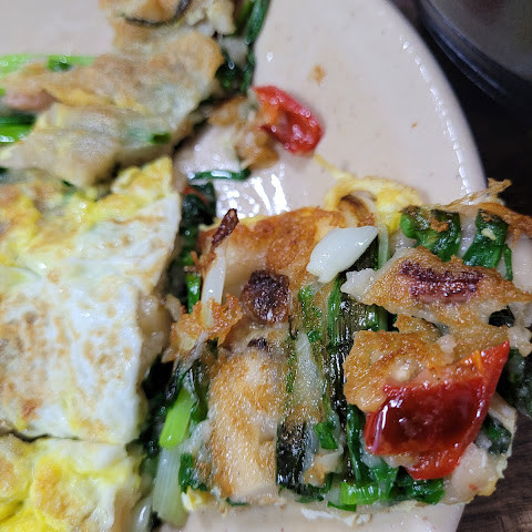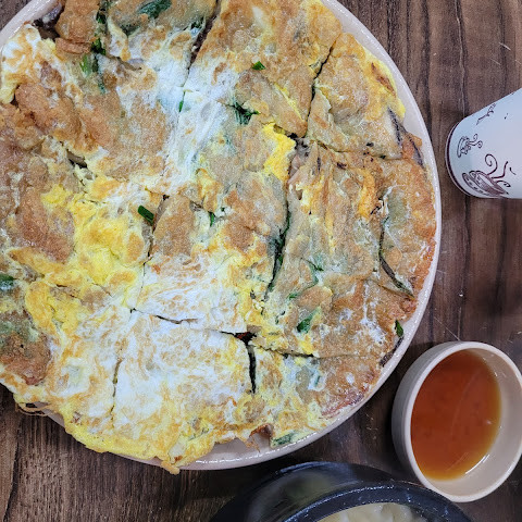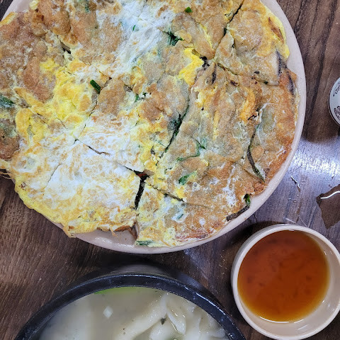 전통 한식당입니다. 손님 대부분이 현지인입니다. 음식은 양념이 잘 되어 있습니다. 하지만 아마 한국인에게만 어울릴 것 같습니다. 저희 둘은 파전 한 접시와 국수 한 그릇을 주문했습니다. 국수는 큼직한 반죽에 조개 내장이 5~7개 정도 들어 있었습니다. 파전에는 낙지 몇 조각이 들어 있었습니다. 배는 불렀지만 전분은 너무 많고 동물성 단백질은 부족한 느낌이었습니다.