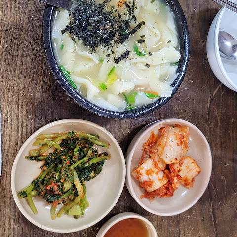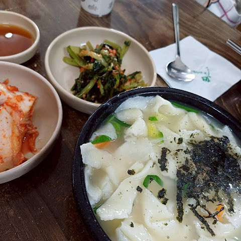 수제비 육수는 진하고 따뜻해서 포만감이 있고, 은은한 조개 향이 나요. 쫄깃한 수제비는 정말 중독성 있었어요. 너무 맛있어서, 특히 신 김치(셀프 서비스)와 함께 먹으니 균형을 잘 맞춰서 다 먹어버렸어요.