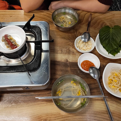 드뎌 와보네요.. 부산 1번이라고들 하던데.. 역시 맛나요.. 다 구워져나와 아주 편합니다.. 약불에 살살 졸여가며 먹는 맛.. 양념 맛나요.. 그닥 자극적이지 않고 덜 맵고.. 곰장어 실하고 깨끗하게 손질되어 나오네요.. 간이 붙어있는 부분은 고소하니 좋아요.. 깻닢에 양파, 마늘 쌈 환상입니다.. 양이 아쉽네요 둘이 3인분 모자란 듯.. 이모님들 빠른 반응 좋아요.. 중국분들이 상당히 오시더이다.. 마늘 꼭다리 제거 안했네요..