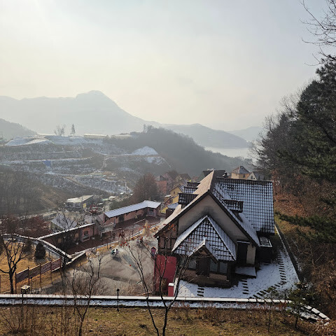 딸아이를 쁘띠 프랑스에 데려갔어요. 드라마 '별에서 온 그대' 촬영지였거든요. 일찍 도착해서 사진 찍을 사람이 많지 않았어요. 정말 좋았어요! 👍