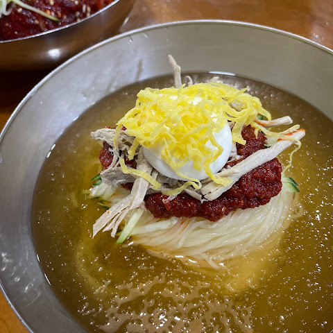약간 노르스름한 빛깔의 면발은 알맞게 차지다는 표현이 딱 어울릴 정도로 쫀득하고, 맑게 우려낸 국물은 정성스럽게 간 살얼음 육수라 시원한 맛이 일품이다. 면발과 국물의 조화가 좋은 밀면집이다.