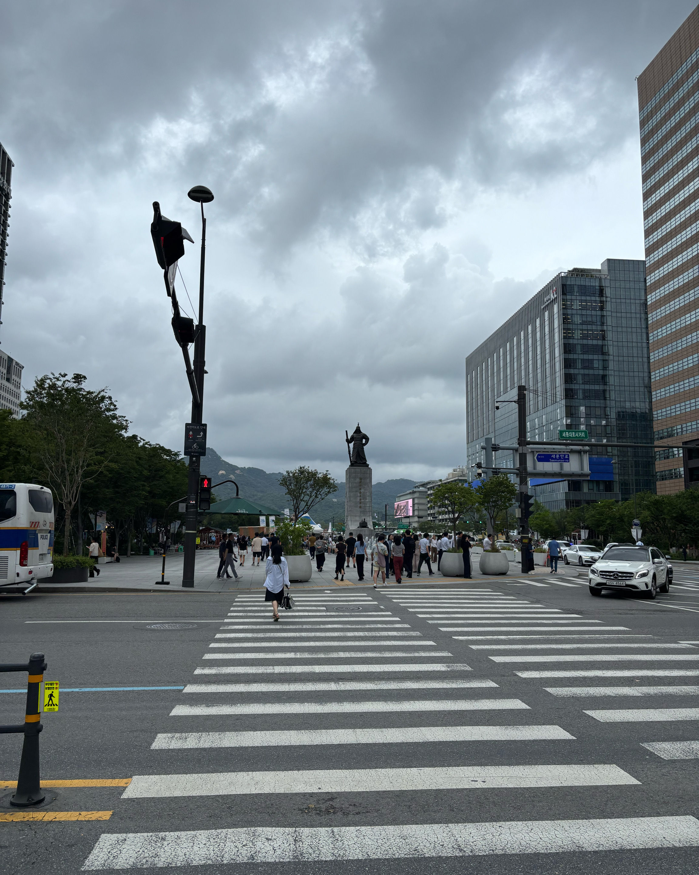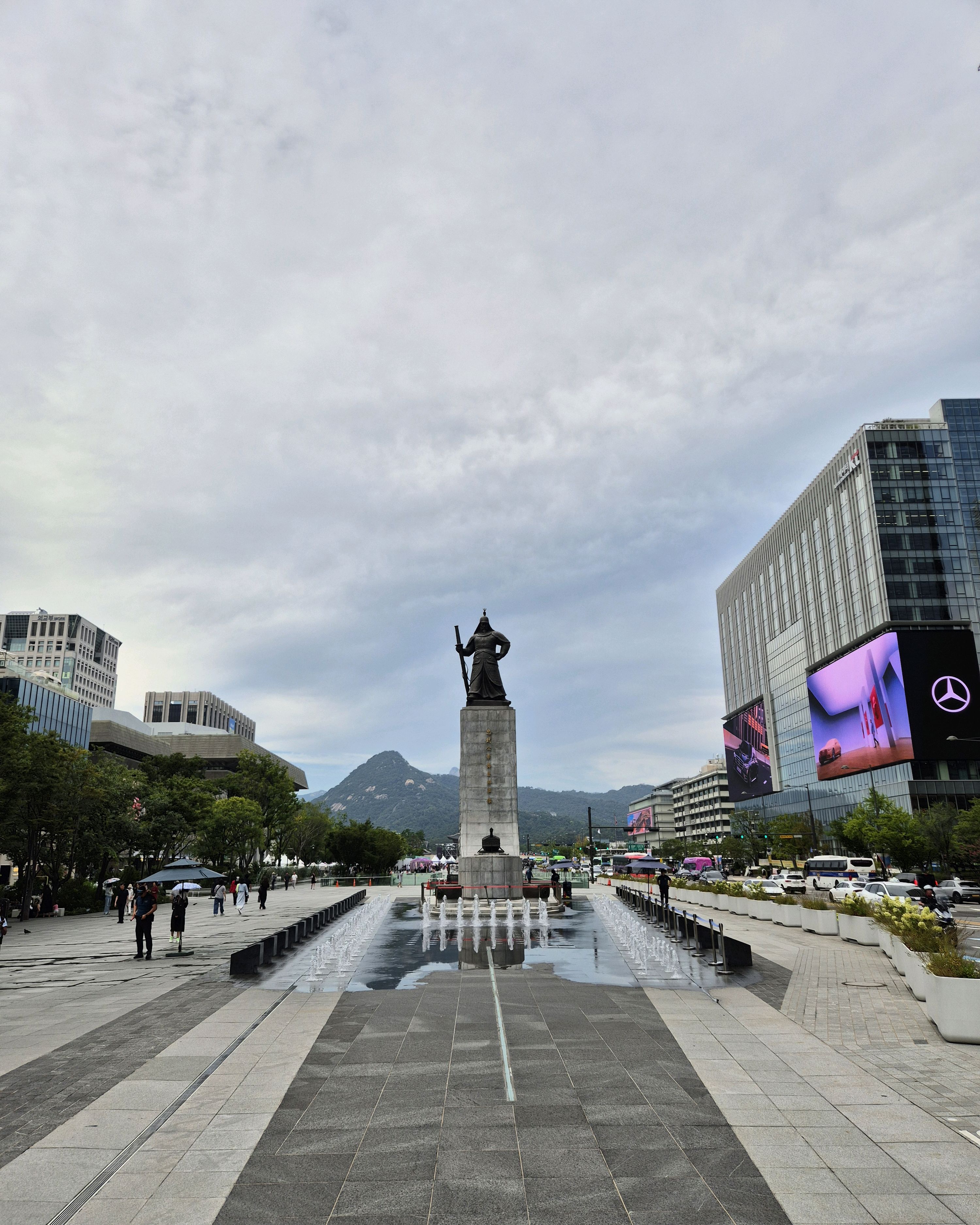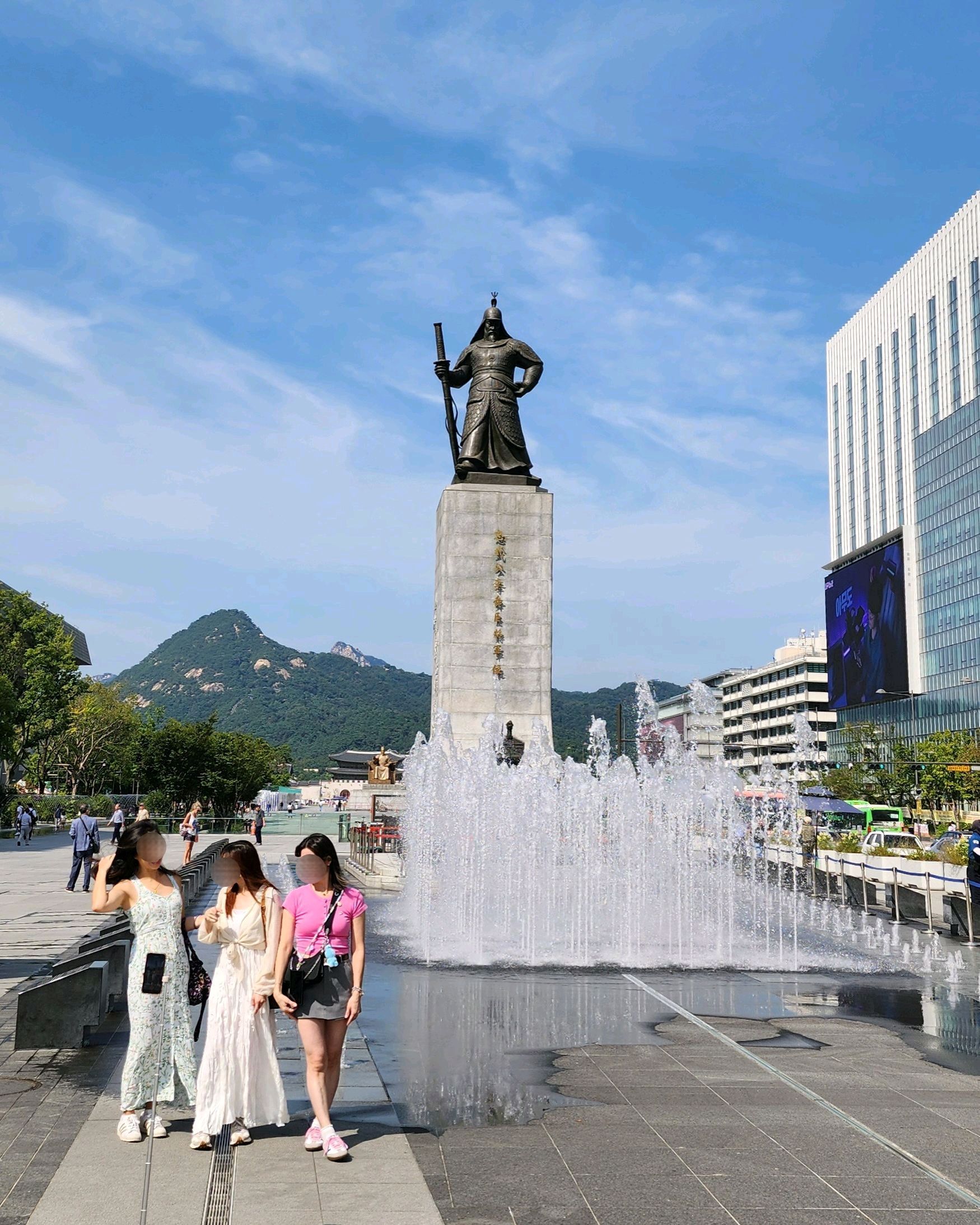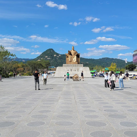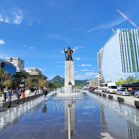 광장 한쪽 끝에서 시작하여 길을 따라 역사적인 인물과 기념물을 천천히 둘러보았습니다. 반대편 끝 광장은 경복궁으로 이어집니다.