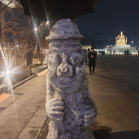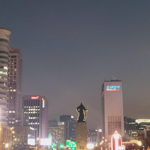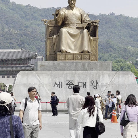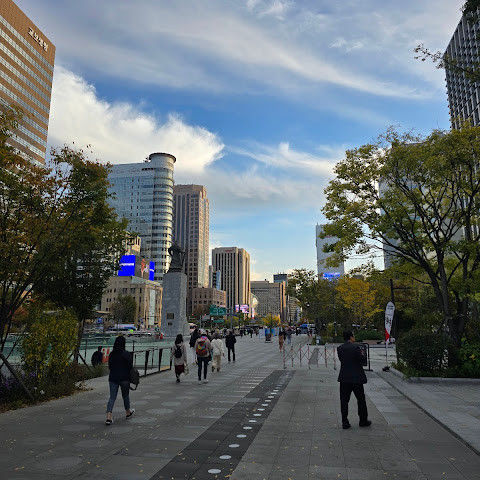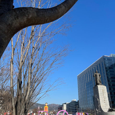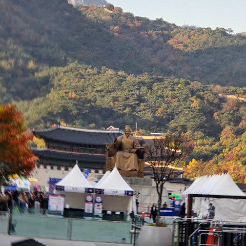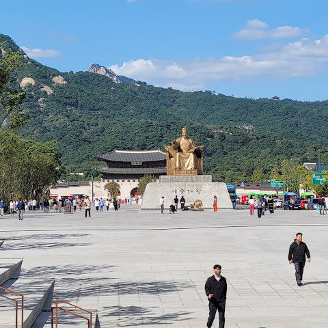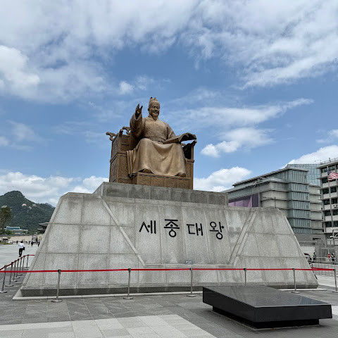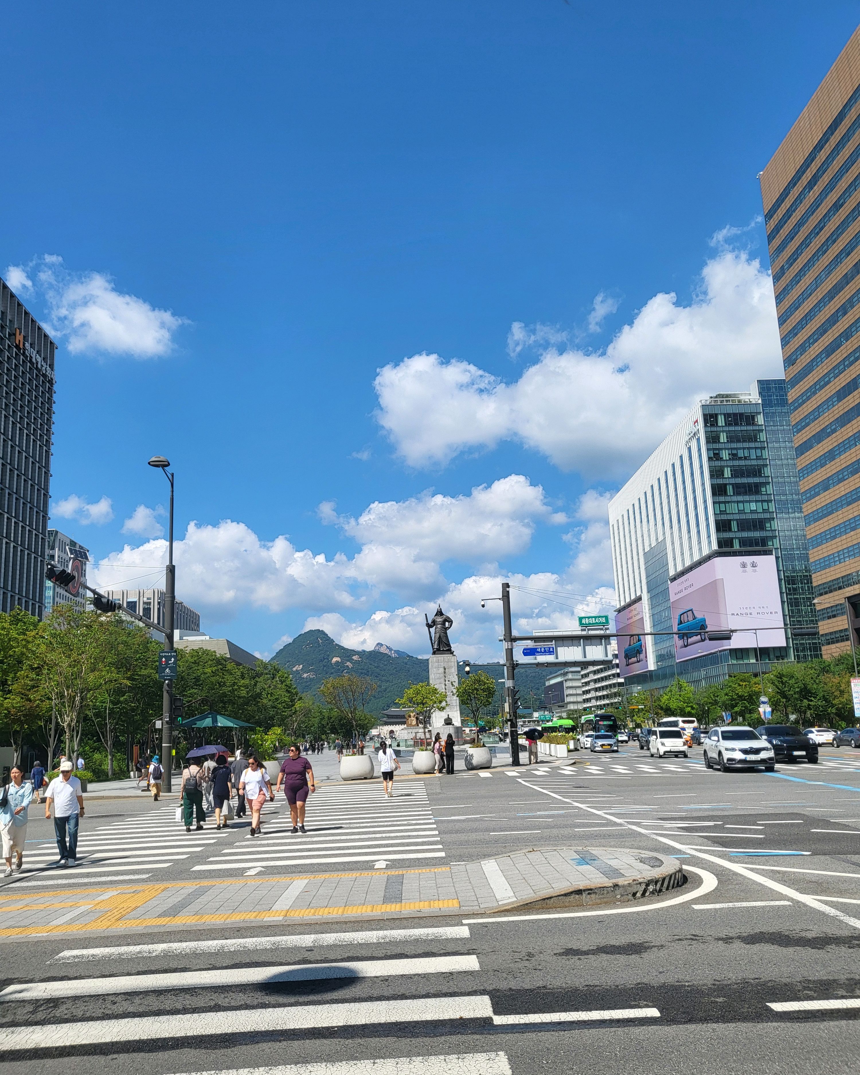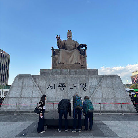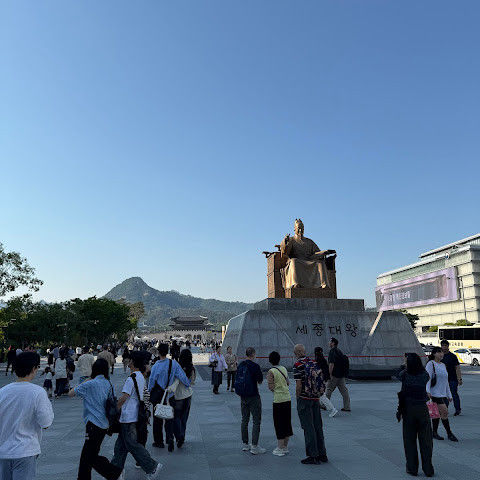 광장 한쪽 끝에서 시작하여 길을 따라 역사적인 인물과 기념물을 천천히 둘러보았습니다. 반대편 끝 광장은 경복궁으로 이어집니다.