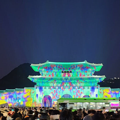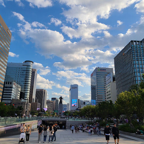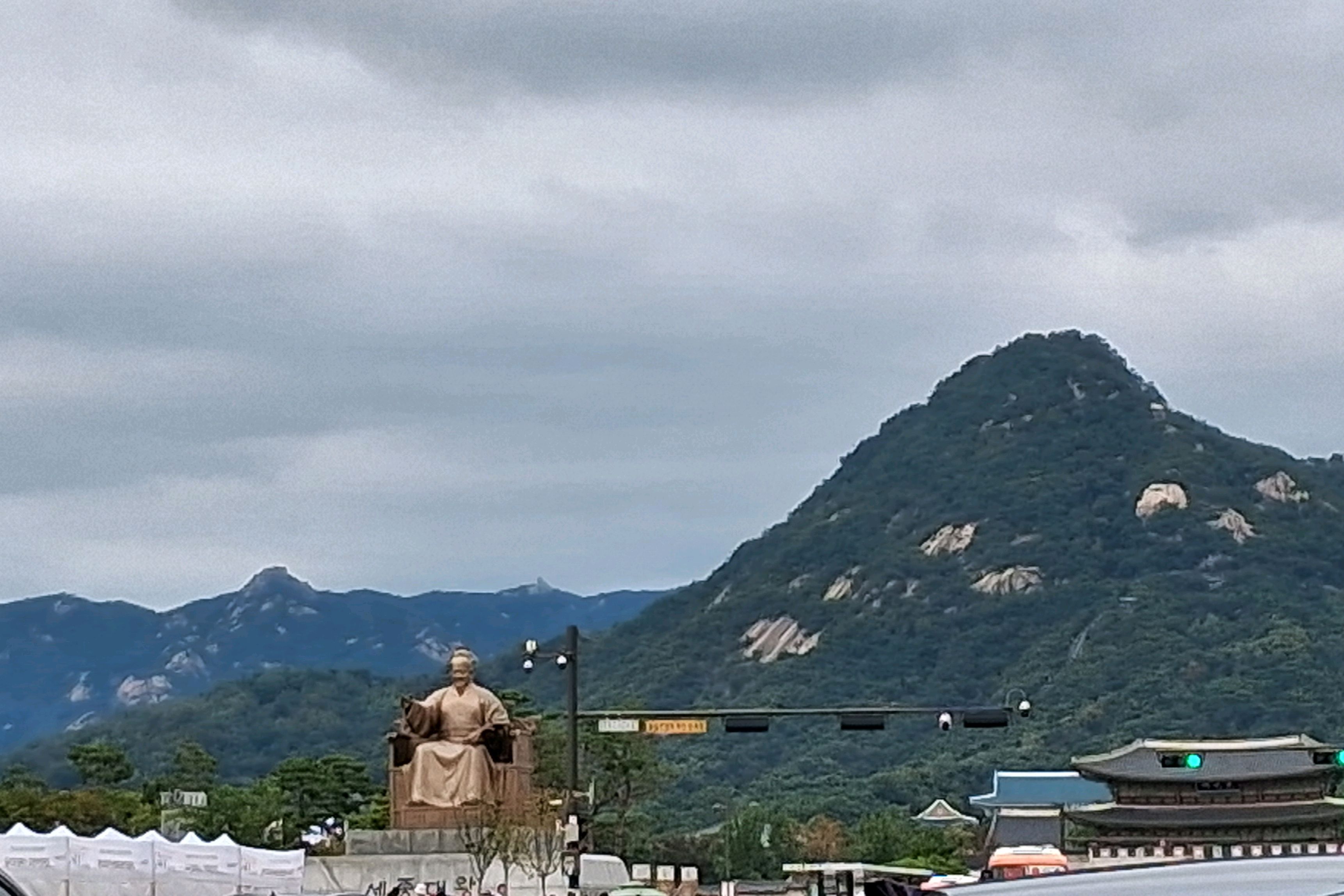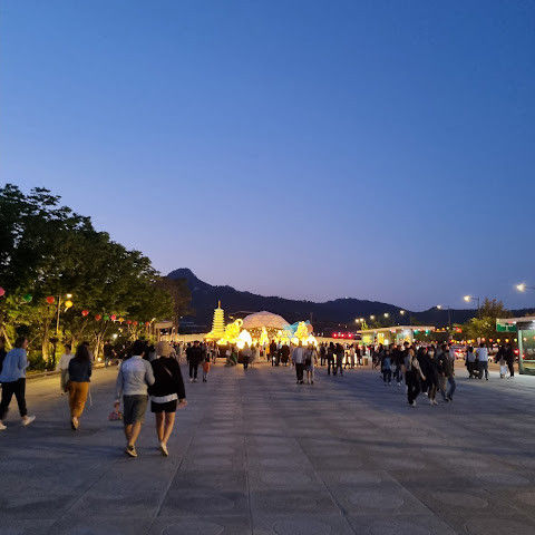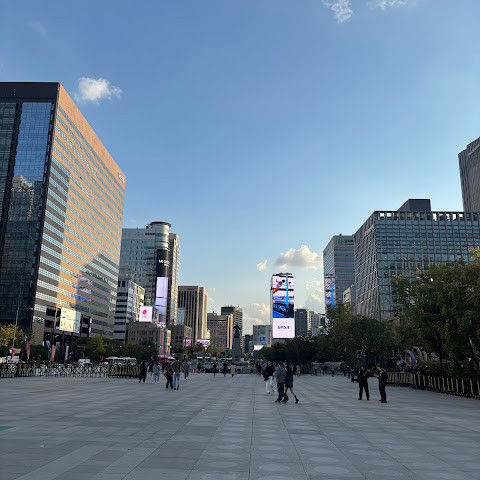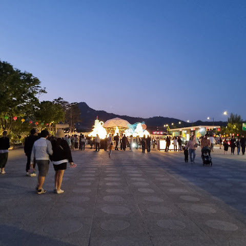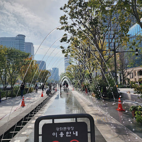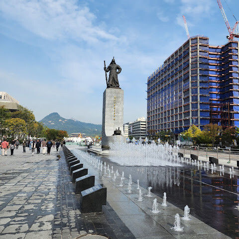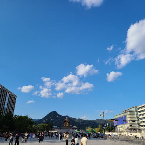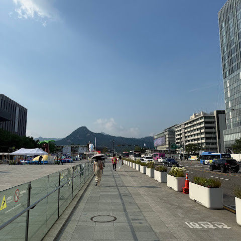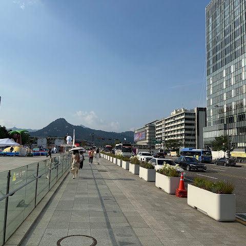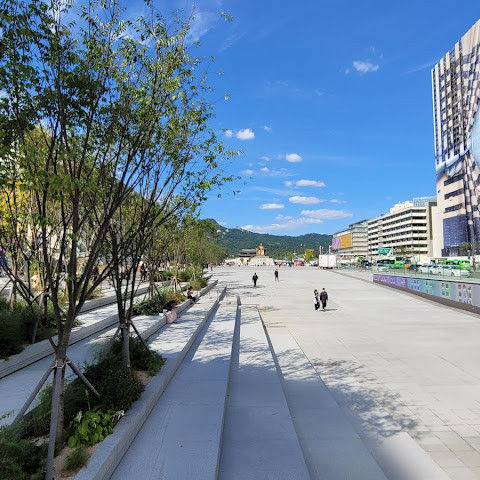 서울 중심부에 위치한 넓은 보행자 전용 도로로, 아름다운 경관으로 둘러싸여 있습니다. 한쪽으로는 북악산을 배경으로 웅장한 광화문과 경복궁이, 다른 한쪽으로는 현대적인 고층 빌딩과 활기 넘치는 도심 교통이 펼쳐집니다.