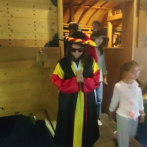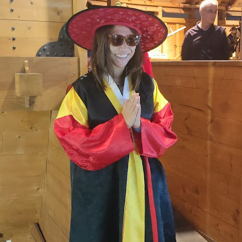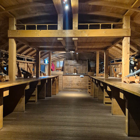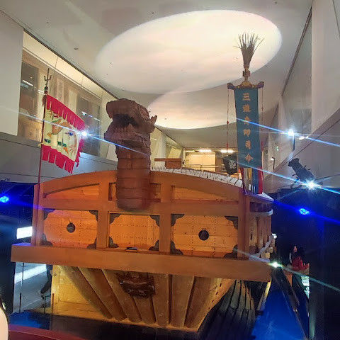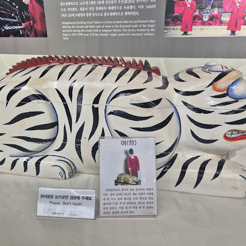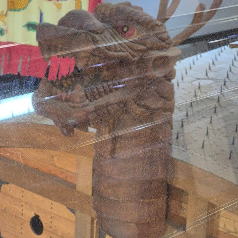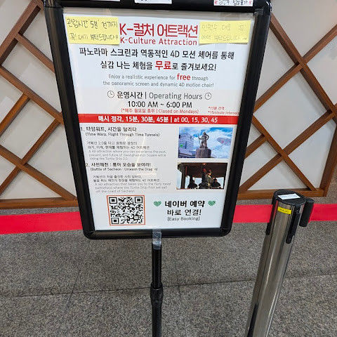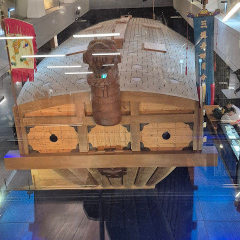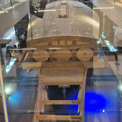 계단이나 엘리베이터를 타고 내려가면 적어도 이 유명한 거북선의 복제품을 볼 수 있을 거예요. 게다가 전통 의상을 입고 복제품 안에 들어가 사진을 찍을 수도 있습니다.