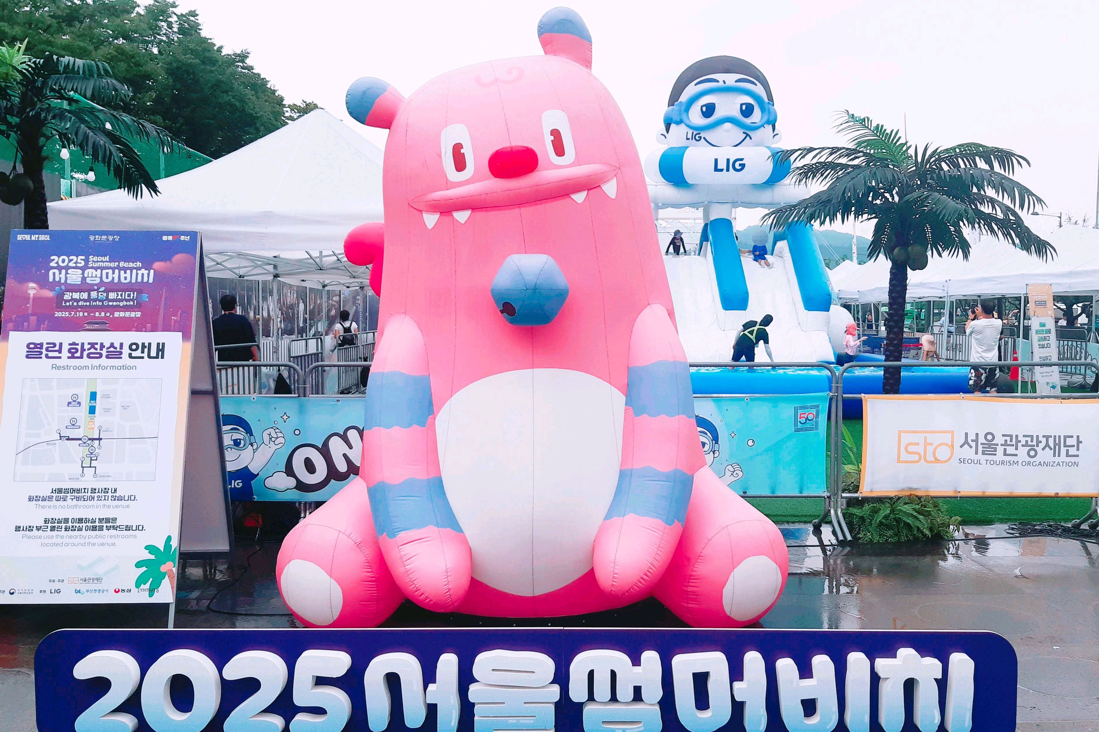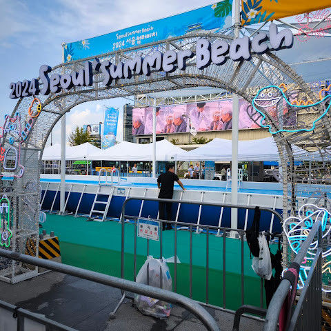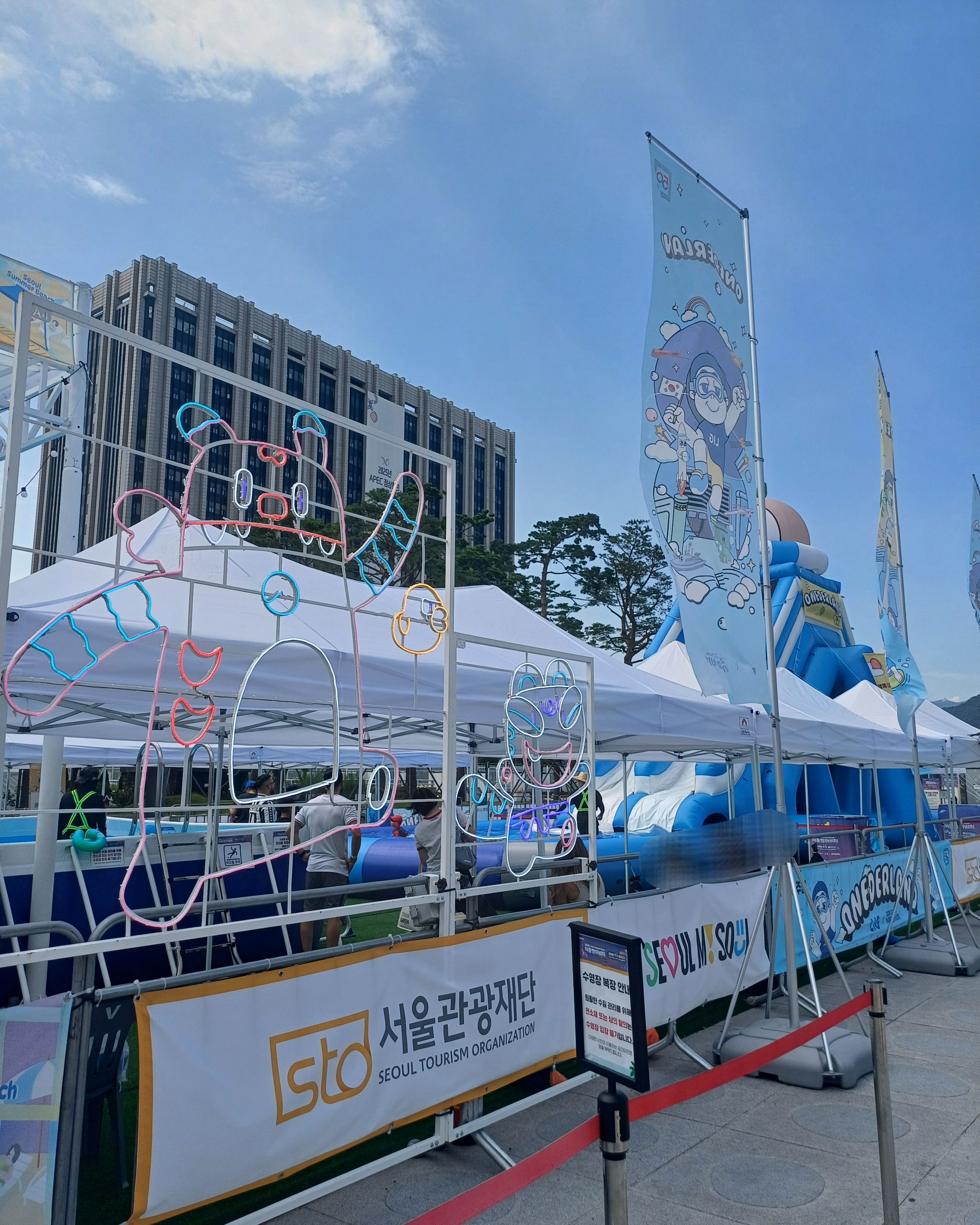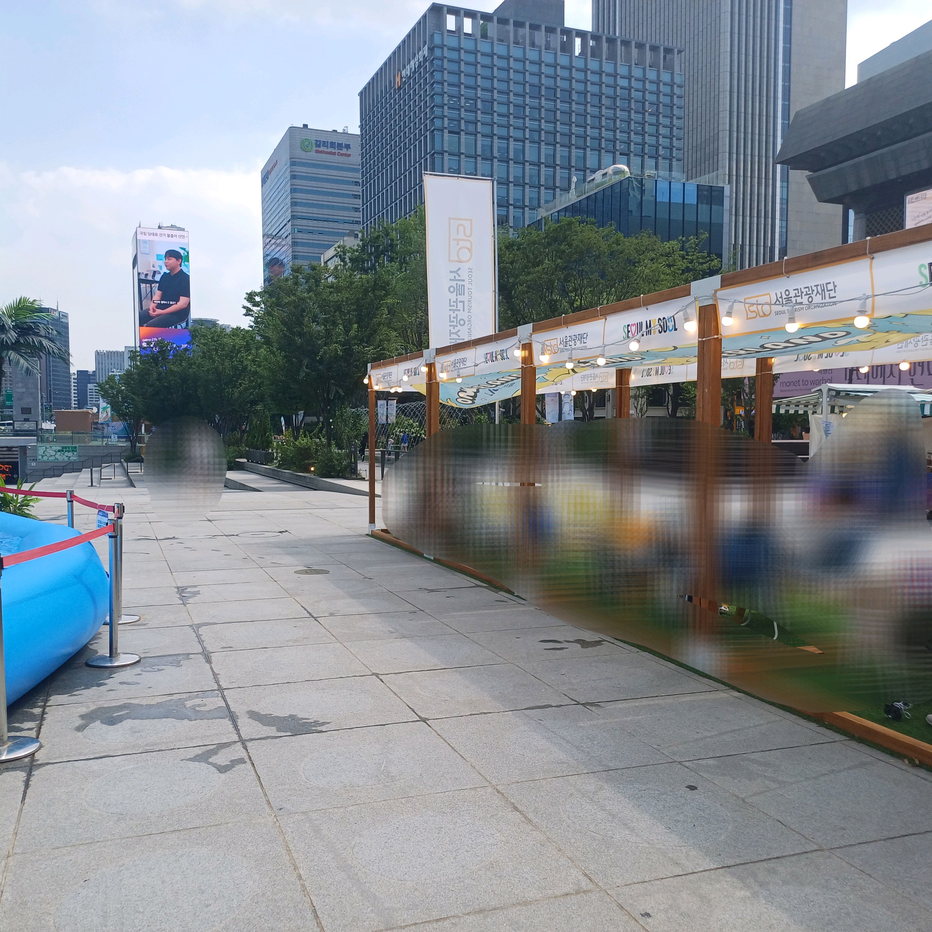 최근에 2025 서울 썸머비치 행사 기간이라서 광장에 대형 놀이 시설들(워터비치존, 샌드비치존)과 각종 행사용 부스들, 커피/음료 트럭들이 설치되어 있었어요~!