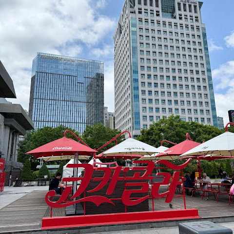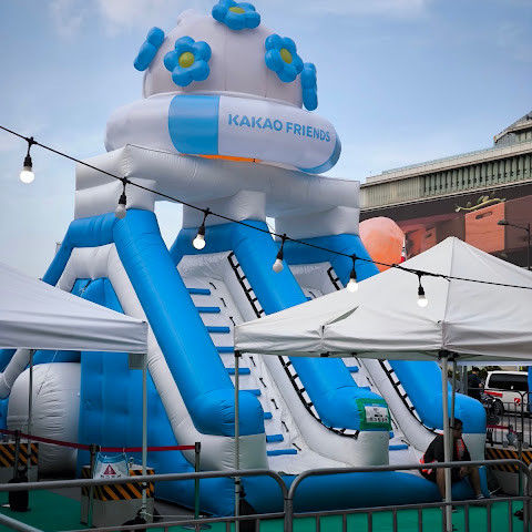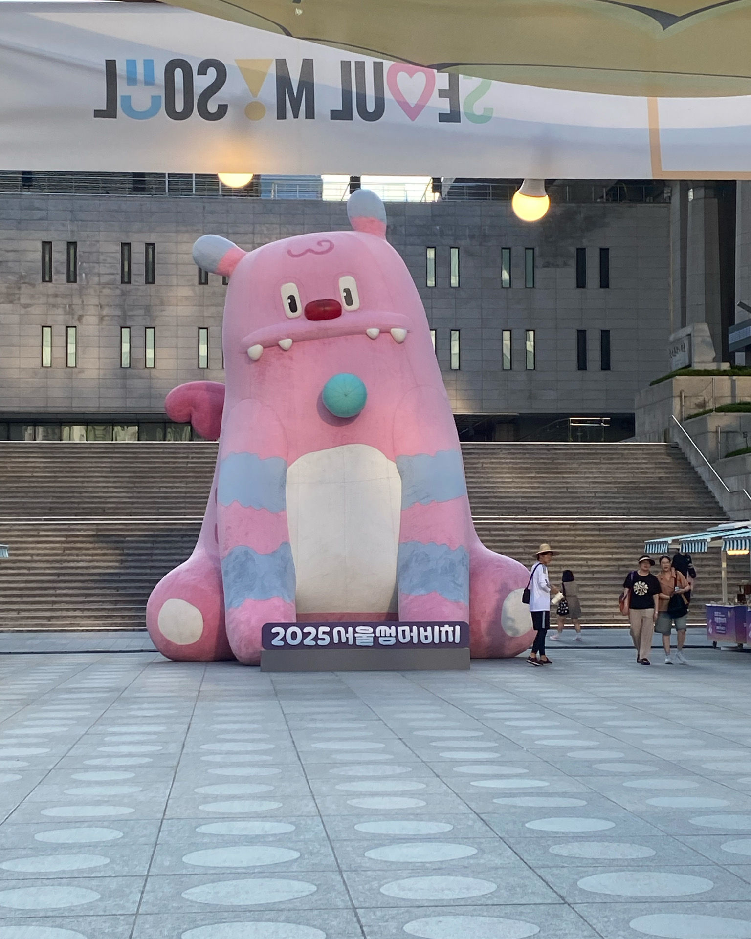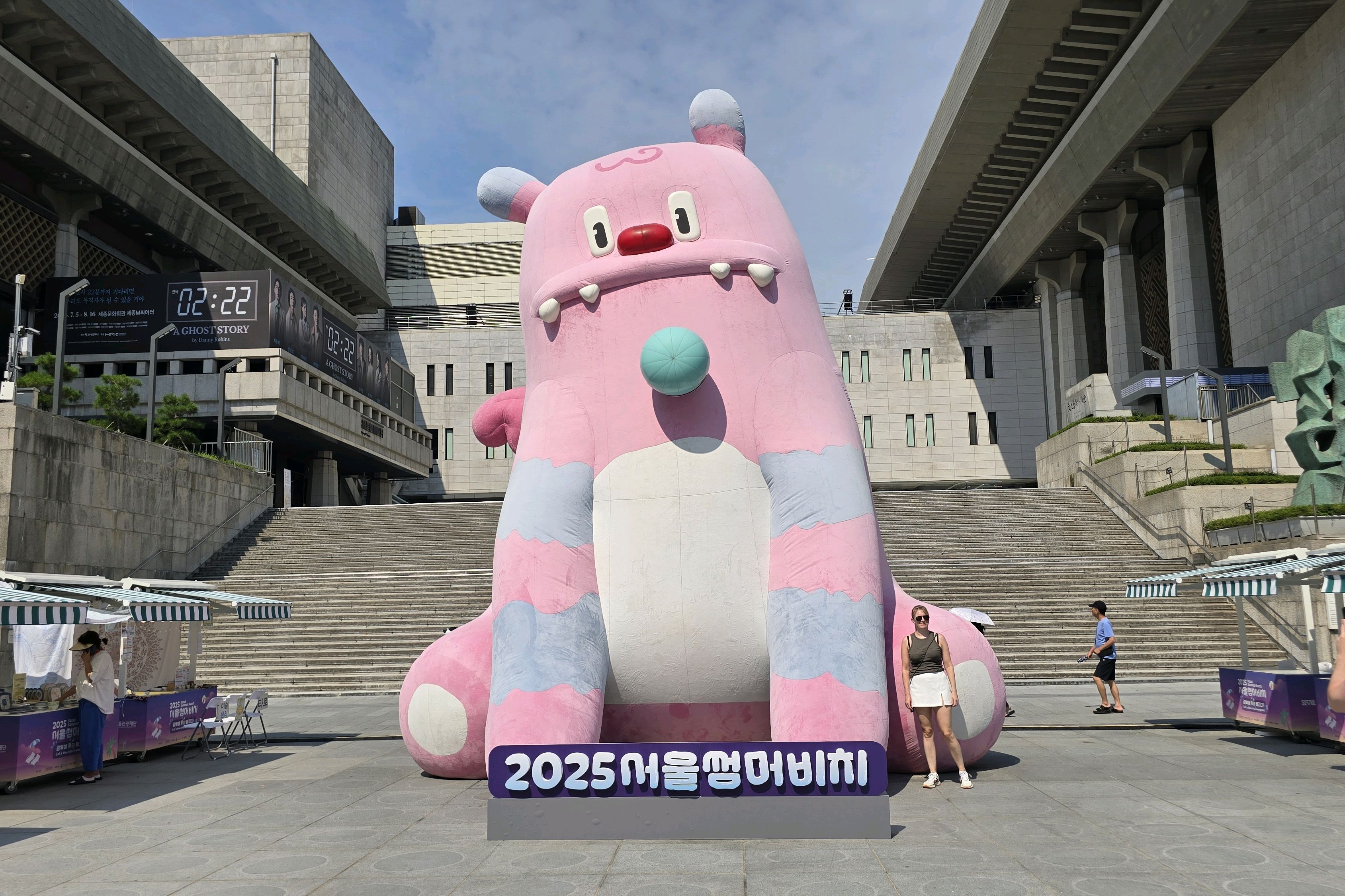 최근에 2025 서울 썸머비치 행사 기간이라서 광장에 대형 놀이 시설들(워터비치존, 샌드비치존)과 각종 행사용 부스들, 커피/음료 트럭들이 설치되어 있었어요~!