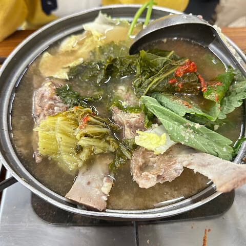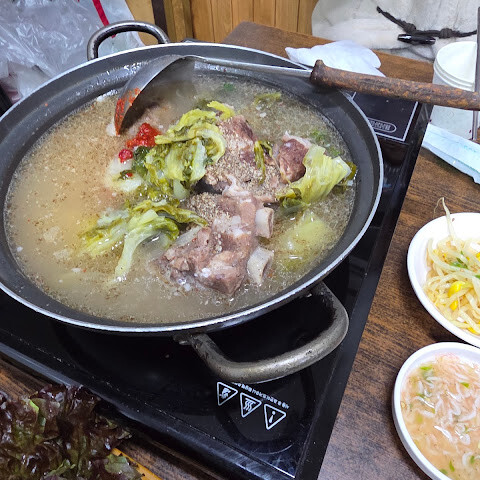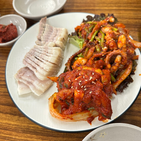 가격이 정말 저렴해요! 문어, 김치, 무절임, 삼겹살 모두 정통 방식 그대로예요. 심지어 뼈 육수도 한 냄비 공짜로 줘요. 강력 추천합니다!