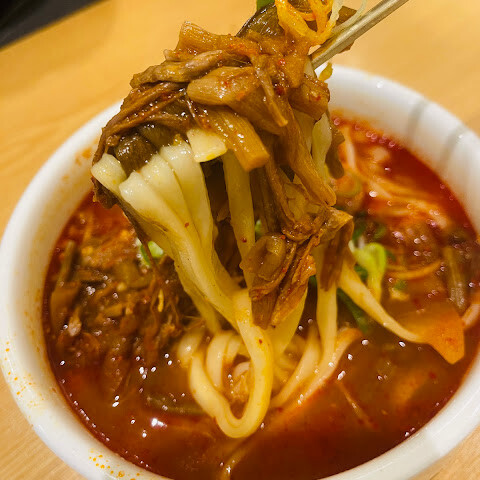 면을 소고기 소스에 찍어 먹으니 훨씬 더 맛있었어요.