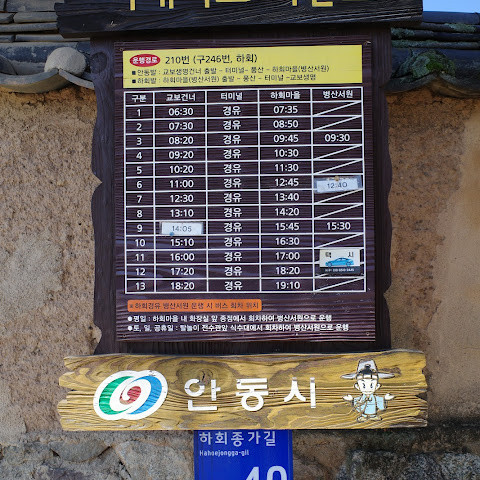 좋은 작은 전통 마을. 안동시외버스터미널(구 246)에서 210번 버스를 타고 이곳에 오실 수 있습니다. 출발시간이 얼마 남지 않았으므로 일정을 꼭 확인하시기 바랍니다. 2024년 10월 현재 이미지에 표시된 대로입니다(버스는 두 번째 열의 타임스탬프보다 약 10~15분 후에 안동 버스 터미널에 옵니다). 매표소에서 하차 > 성인 5,000원 티켓 구매 > 무료 셔틀버스(10분 간격)를 타고 3분 정도 가면 마을 입구에 도착합니다. 주변을 둘러보는 데 약 1~2시간 정도 소요