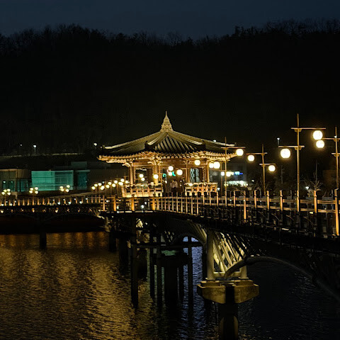 월영교의 야경은 평화, 아름다운 풍경, 그리고 전통의 멋을 찾는 이들에게 숨겨진 보석과 같습니다. 로맨틱한 산책을 즐기는 커플, 아이를 동반한 가족, 또는 멋진 야경 사진을 찍고 싶은 여행객에게 안성맞춤입니다. 고요한 강물과 은은한 조명이 어우러진 전통 한국 건축 양식은 마치 시적인 분위기를 자아냅니다.